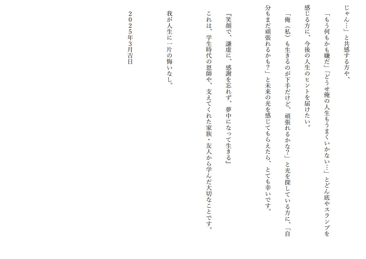 この自伝の漫画化も目指しています。プロットや漫画版ティザーの公開も検討中で、若い世代にも共感と希望を届けたいと考えています。