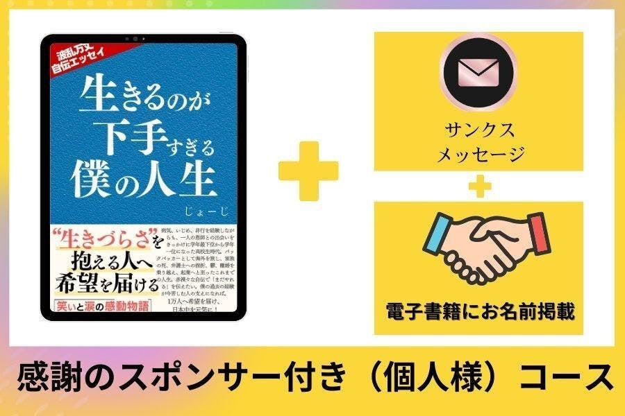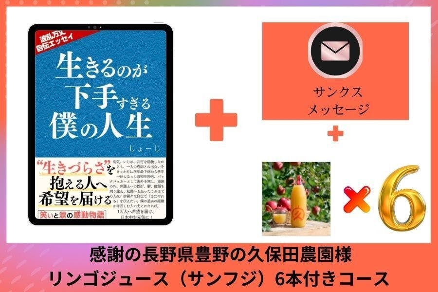 2025/05/14 00:31人生初のクラウドファンディング。ついに始動しました!そして…なんと、開始早々にさっそくご支援をいただきました!!こんな時間にも関わらず、本当にありがとうございます。正直、まだ実感が湧かないほど驚いています...心から感謝しています。このプロジェクトは、「もうだめだ…」と感じた経験のある生きづらさを抱えて生きているすべての方に届けたい物語です。一人でも多くの方に、この想いを届けるため、挑戦が始まりました。支援していただいた方には、【完成書籍の先行お届け】や【お名前の掲載】、【長野県産のリンゴジュース】など、ここでしか得られないリターンをご用意しています。「人生は変えられる」そう信じられるきっかけとなるよう、全力で走ります。今後の進捗もこちらでお知らせしていきますので、引き続き見守っていただけたら嬉しいです!どうか、どうか、皆様の応援をよろしくお願いいたします。 もっと見る
