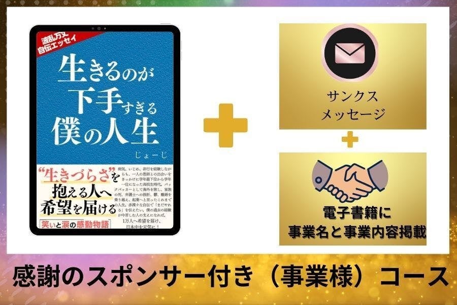 ・書籍内「スペシャルサンクス」として書籍の最後に事業名・内容を掲載(150文字以内・文字のみ)