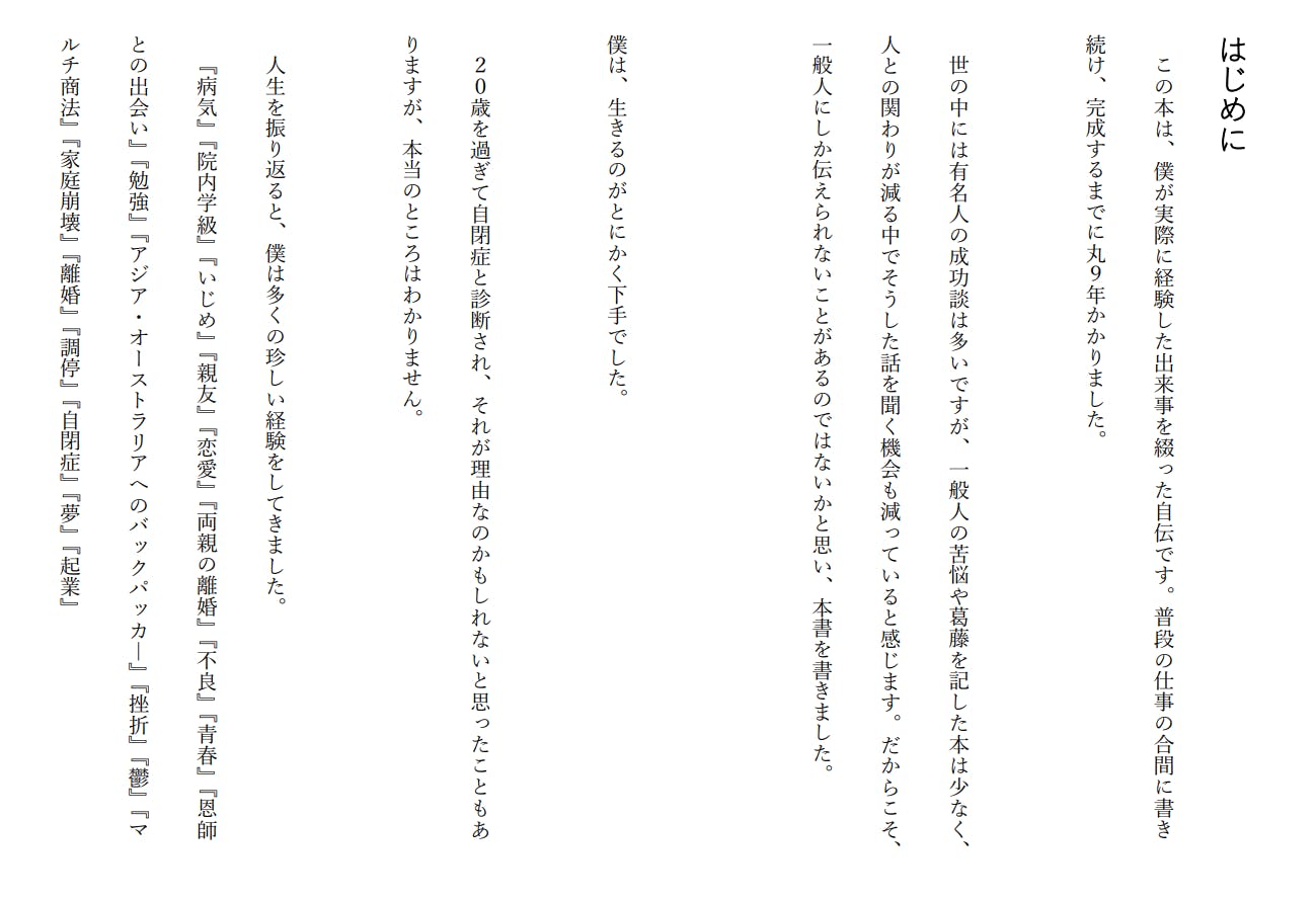 →確かに技術的には可能ですが、「執筆+プロモーション+人生を晒す覚悟」は誰にでもできることではないと思っています。そのぐらい、僕は今回の出版に人生をかけていますし、このプロジェクトにも人生をかけています。