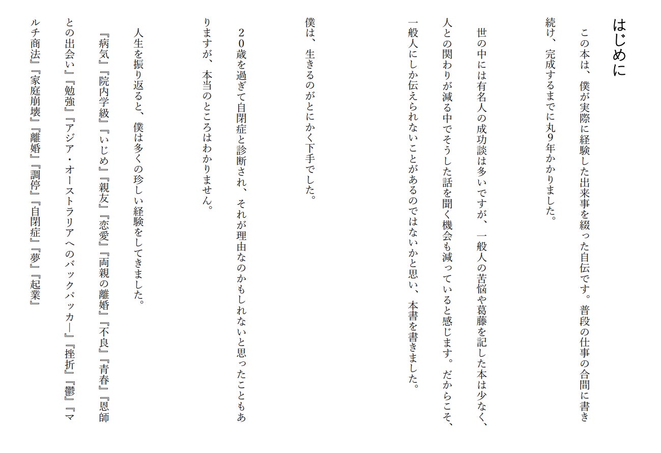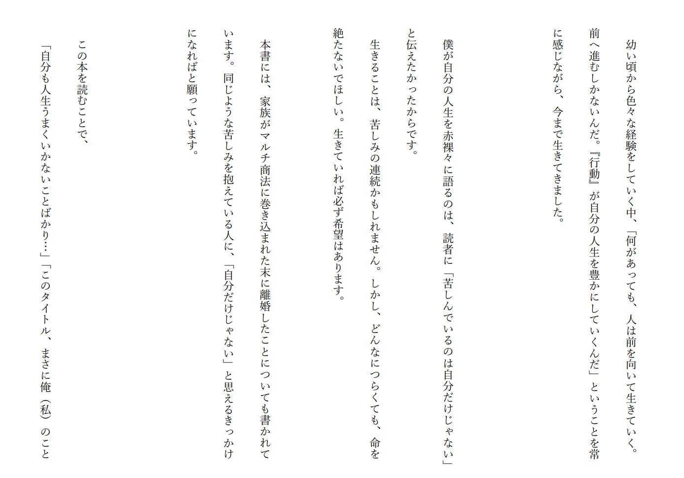 →確かに技術的には可能ですが、「執筆+プロモーション+人生を晒す覚悟」は誰にでもできることではないと思っています。そのぐらい、僕は今回の出版に人生をかけていますし、このプロジェクトにも人生をかけています。