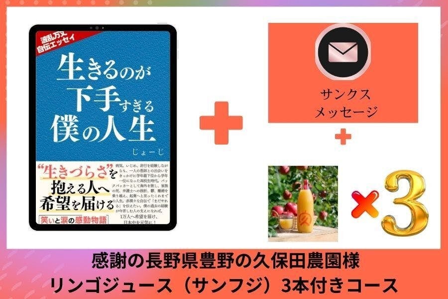2025/05/14 00:31人生初のクラウドファンディング。ついに始動しました!そして…なんと、開始早々にさっそくご支援をいただきました!!こんな時間にも関わらず、本当にありがとうございます。正直、まだ実感が湧かないほど驚いています...心から感謝しています。このプロジェクトは、「もうだめだ…」と感じた経験のある生きづらさを抱えて生きているすべての方に届けたい物語です。一人でも多くの方に、この想いを届けるため、挑戦が始まりました。支援していただいた方には、【完成書籍の先行お届け】や【お名前の掲載】、【長野県産のリンゴジュース】など、ここでしか得られないリターンをご用意しています。「人生は変えられる」そう信じられるきっかけとなるよう、全力で走ります。今後の進捗もこちらでお知らせしていきますので、引き続き見守っていただけたら嬉しいです!どうか、どうか、皆様の応援をよろしくお願いいたします。 もっと見る