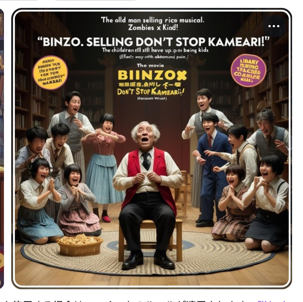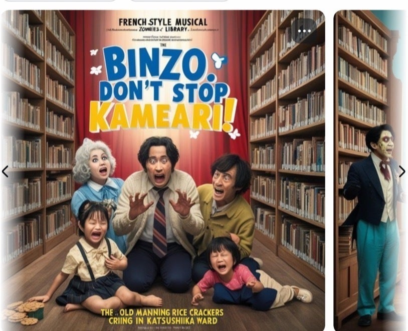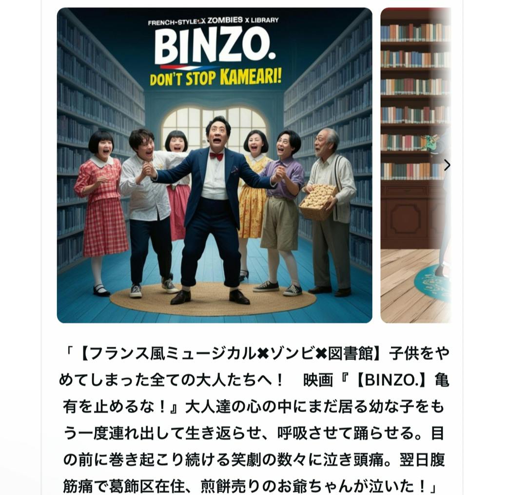 《ある日、図書館内で大量発生したBINZO.しかも、彼らは踊りながら人々を襲う“ミュージカル•ビンゾだった。主人公西山は、図書館の生き延びた人々とともに歌って踊りながらゾンビに立ち向かう…!》