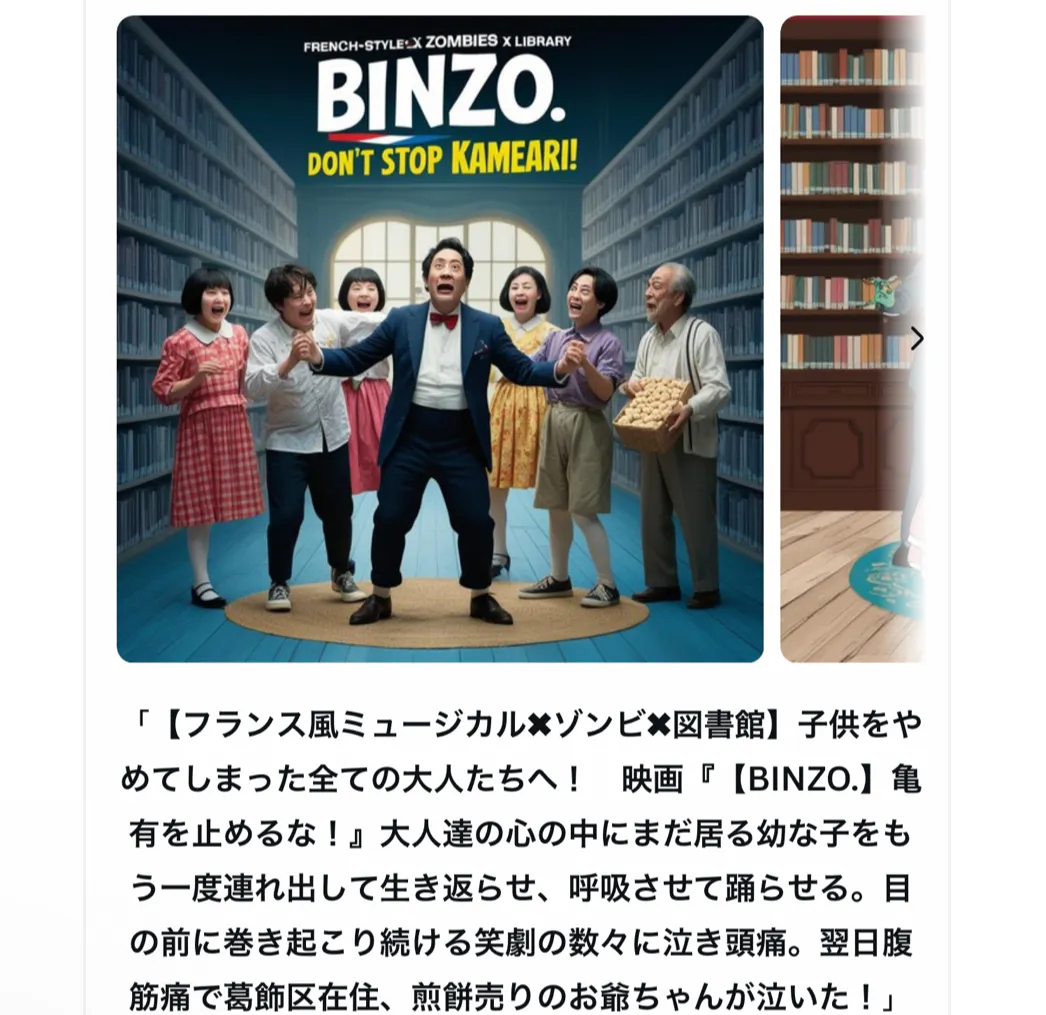かねてより構想して来た私の映画、フランス風ミュージカルゾンビ映画『BINZO.』の話をしました。
