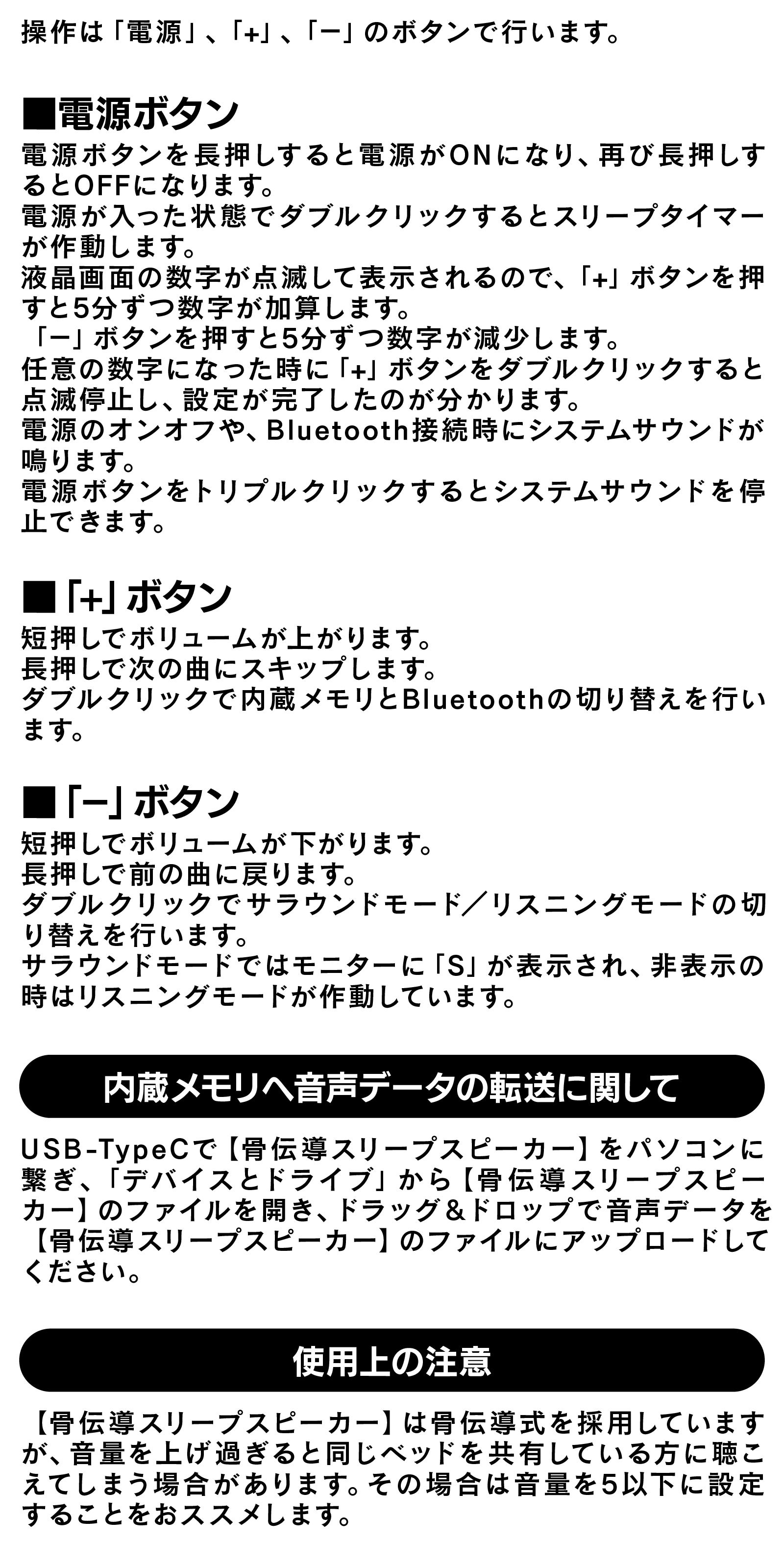 また【骨伝導スリープスピーカー】は32GBのメモリを内蔵し、一般的な音楽なら8,000~10,000曲も収納できます。