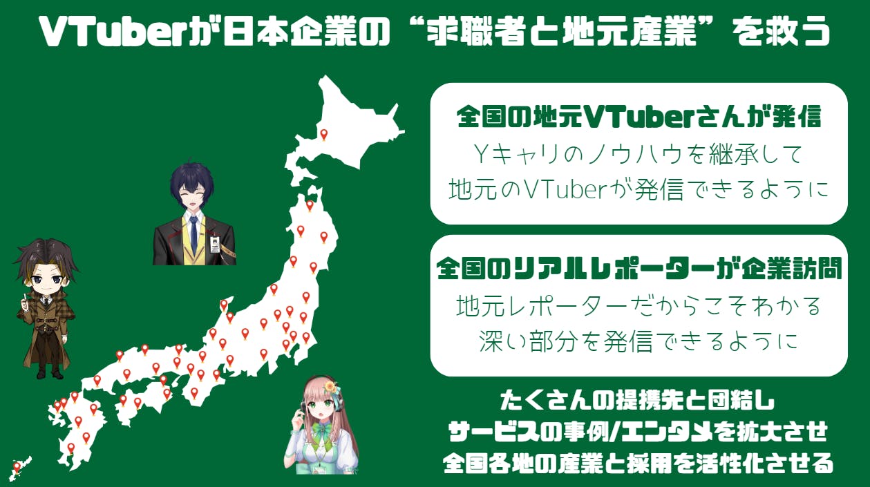 今回の新サービスである「Yキャリ」は、同じ想いで共感していただける全国の企業やVTuberさんと事業提携を行い、私たちだけの力では届かない地域の産業や採用を活性化させるために、