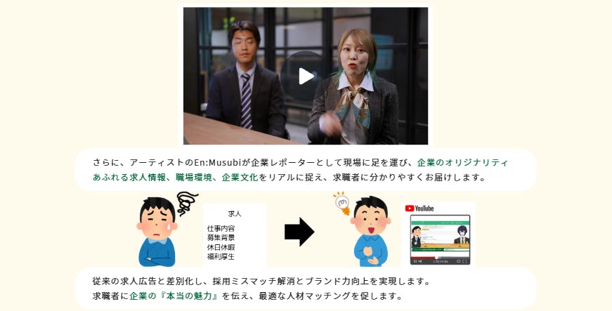 En:Musubiが企業レポーターとして、企業へ訪問し雰囲気など求職者の方々によりわかりやすく企業の良さを伝えられるようにレポートします