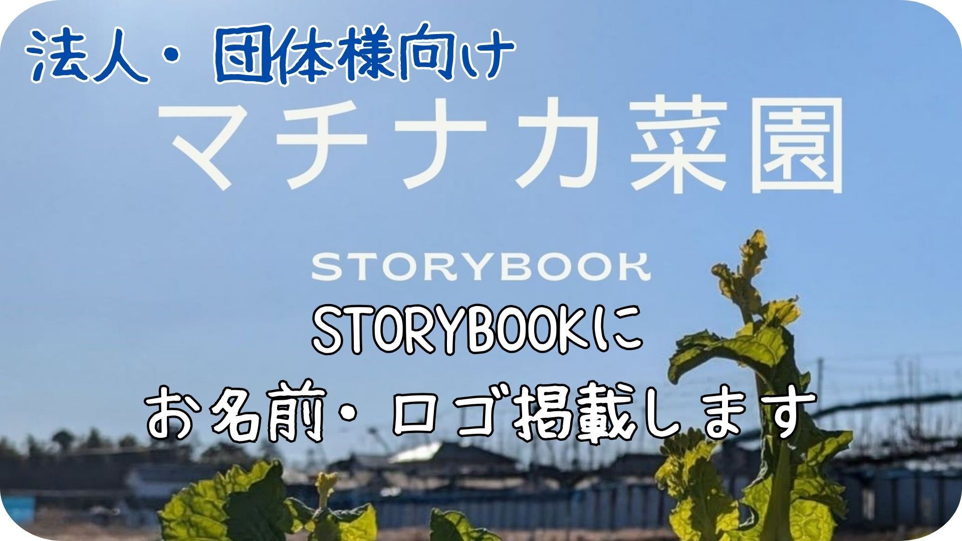 このストーリーブックの中に応援してくださった皆さんのお名前を掲載しますが、こちらのリターンを選んだ法人・団体様はマチナカ菜園の応援団として名前またはロゴを大きく掲載させていただきます!