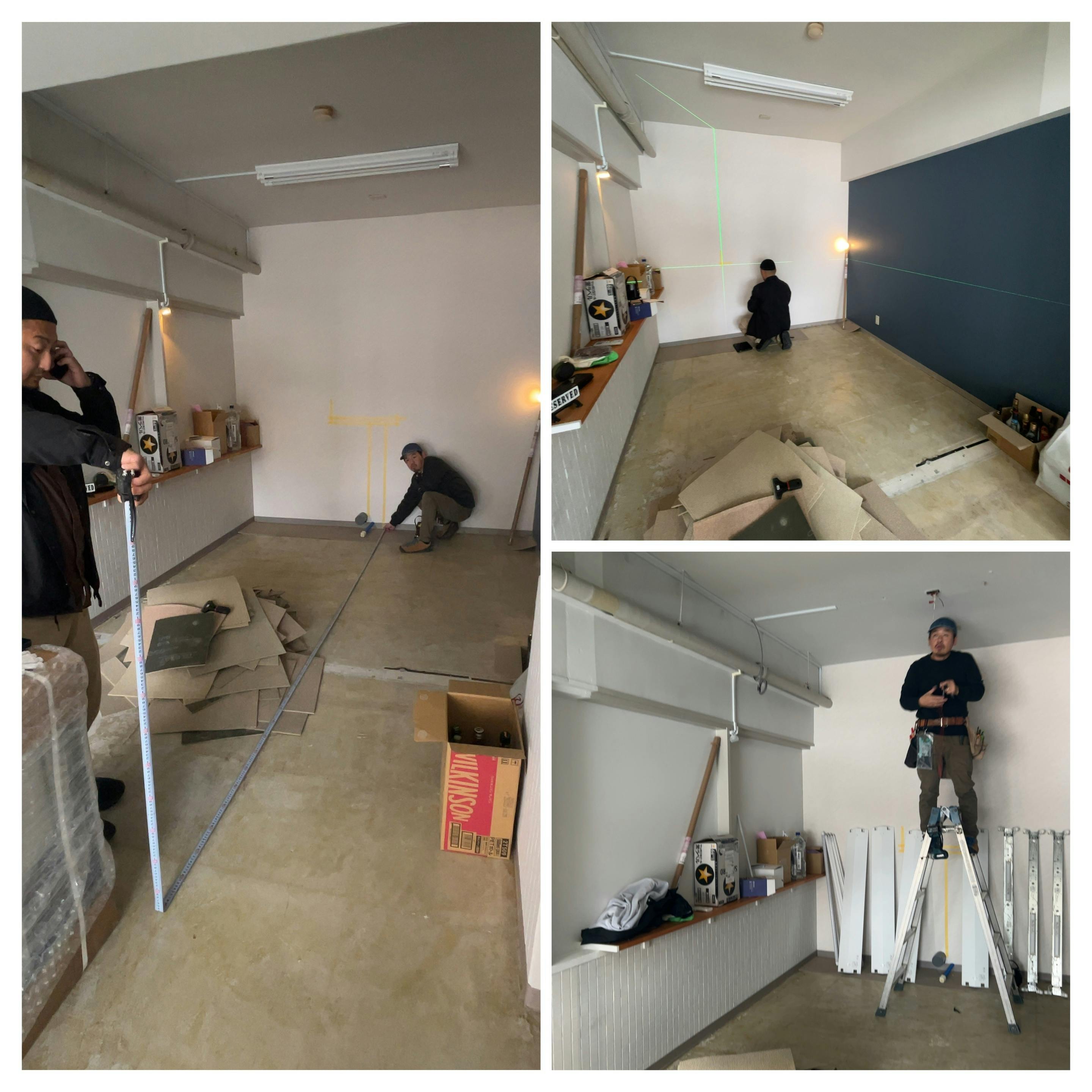 照明はライティングレールに、カウンター天板はタモ合板で、棚にはテープライトを入れてボトルを照らす感じで考えています。