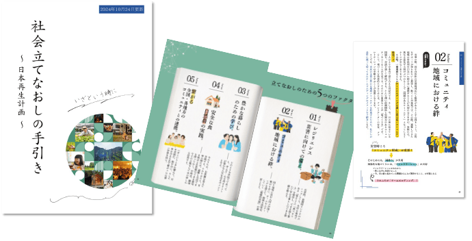 本協議会が掲げるビジョンを実現するために「社会立てなおしの手引き」を作成しました。災害への長期的対策の方法から、その後、社会を立てなおすために必要となるメソッドをわかりやすくまとめています。本誌で掲載しきれない内容については、QRコードで映像や情報にアクセスいただけるように構成しています。更に、各カテゴリーについてより詳しく学ぶことができるオンラインウェビナーやe-Learningの仕組みも構築しています。