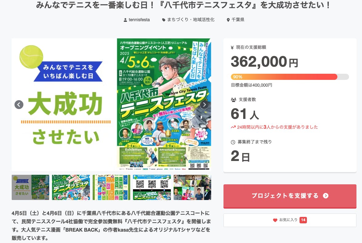 「八千代市テニスフェスタ」クラファン残り2日!