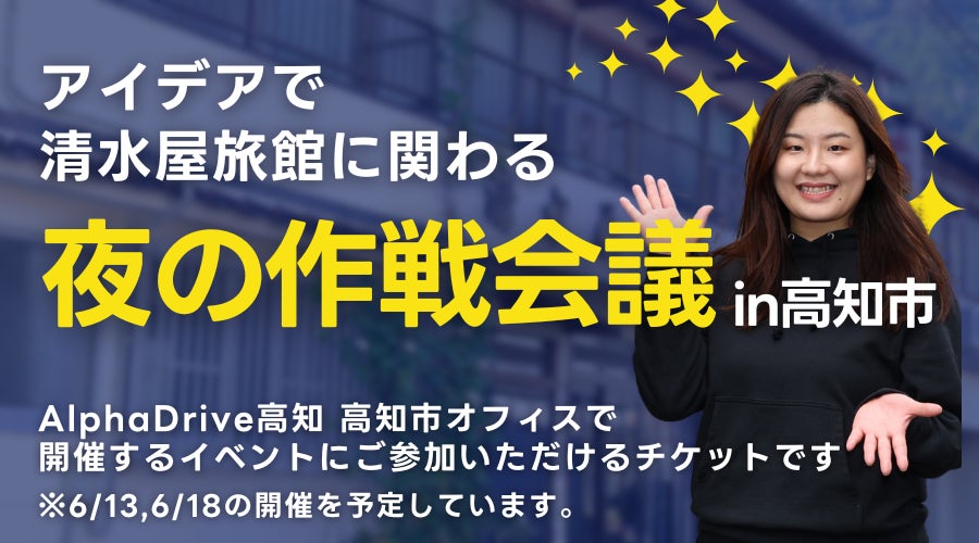 6月13日(金)にアルファドライブの高知市オフィスで実施する夜のイベントです!ぜひ、お酒を飲みつつ清水屋の未来について一緒に考えていただけると嬉しいです・・!なお、嶺北の焼酎メーカーばうむ合同会社本山蒸溜所の焼酎の試飲も実施いたしますよ〜!