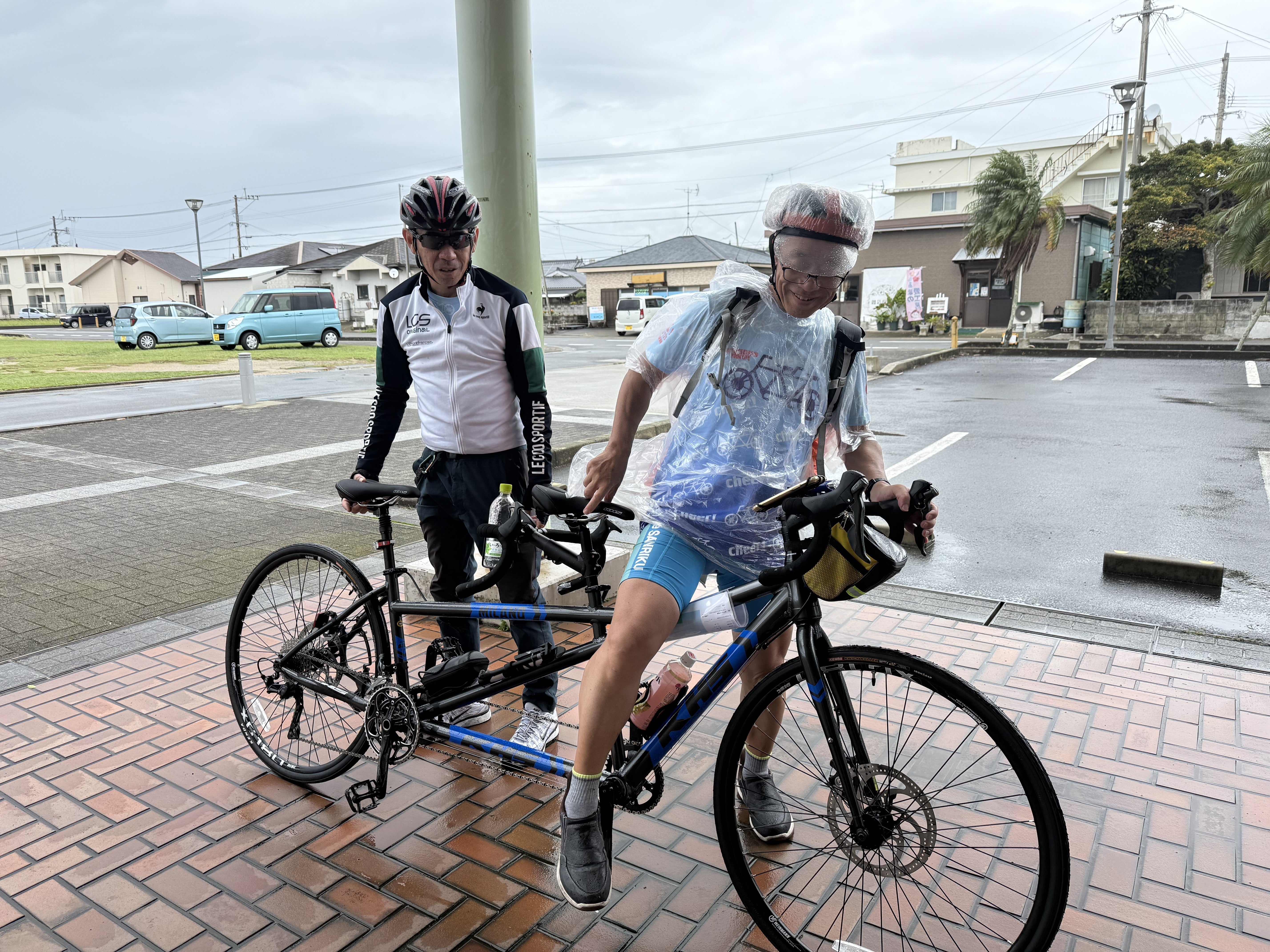 2025/12/04 10:50タンデム自転車試乗レポート第2弾は、NPO活動法人サイクルボランティアジャパンの中西淳一さんのレポートです! NPO活動法人サイクルボランティアジャパン https://cvjapan.org/ ーーーーーーーーーーーーーーーーーーーーーーーーーーーーーー 徳之島タンデムツーリング感想文:中西淳一:2025年11月14日 1日目11月5日(水) 早朝、奄美大島天候悪く伊丹空港戻るかもしれない条件付きで離陸を予定のアナウンス、この時点で野村さんなふらいとは定刻通りとなっているが、後に野村さんも同様に引き返し条件付きフライトとの事、地上案内の人に確認すると、3段階の一番低いレベルではあるがとの事、また佐多さんも鹿児島から徳之島に行く便が定刻通りとの事から、思い切って飛行機に乗ることにした。 15時30分頃、佐多さんから、2人の無事徳之島上陸を祝ってくれるLINEのすぐ後に、タンデム開封しましたと一言。実はその時点までタンデム自転車がどこにあるのか?到着するのかが未確定で、ずっと運送会社とやり取りやって頂いた結果、この5日にやっと徳之島に上陸して、翌日以降配送予定だったらしく、それじゃ間に合わないからと、わざわざ運送会社さんまで引き取りに行ってくれたそうで、その話を後から伺い、ビックリするや、恐縮するや、何とか翌日からのタンデムライドに強引に間に合わせていただき、感謝感激。 空港バスで約1時間かけて塩浜バス停迄移動、あと徒歩で約10分で、里さんの親戚の方が経営する、徳洲屋旅館に宿泊、素泊まりだったので、少し歩いて名瀬の街に少し雨が降ってはいたけど夕食処探しに行った。マツキヨでお酒、ツマミを買って、そこで預かってもらい更に街の中心地の居酒屋、呑みんちゅで、地のさかななど結構たくさん食べた。南の魚は大味と聞いていたけど、コリコリして脂がのってとても美味しかった。 油ソーメン、夜光貝、赤うるめの刺身と骨は焼き、たまごおにぎり、焼き豆腐、 次々とお客さんが訪れて、4歳の店のかわいい女の子が、お膳を引いてお手伝いしていたのが可愛かった 食べ終わって旅館に戻り就寝 2日目11月6日(木) 朝5時30分出航のフェリーに乗るために4時30分過ぎに旅館を出た。 フェリーは鹿児島を昨夜出てきた船が着岸、この後、徳之島を経て沖縄に向かいますが、こちらもまた5日時点で、天候不良の場合は徳之島には寄港せずに飛ばしていくとの条件付きでの乗船となった。これまた9時過ぎ着岸出来て、なんとか徳之島に上陸出来た。 佐多さんと里さんのお姉さんが、わざわざお出迎えにお越し頂き、佐多さんの会社絆ファームの事務所迄、車で送っていただき、今回の走行コースや、食事の段取りなどを軽く打ち合わせ その後、タンデム2台が置かれる益田モーターズの益田さんとこに伺い、先ずはタンデム自転車のKHSミラノと言う、二台のうち大きな方を開封していった。ここのオーナー益田さんは85才?とのことだけど、見た感じ肌つやも良く、68才の私よりしわも少なくて、若く見え、話し方もずっと若く、ビックリした。既に大阪の自転車屋さんで、メーカーから送られてきた自転車を基本的な組み付けと調整はしていただいていたものの、イメージはそのまま箱に入れて運ばれているイメージだったけど、ハンドルやサドル、ペダルなどは、後から組まないといけず、厳重に包まれた包装紙やプチプチを慎重に剥がしながら組み立てていった。ラチェットタイプのネジが少し空回りするので、後日取り寄せて付け替えていただけようにお願いした。 おそらく気温はかなり暑くなってきて27℃くらいはあったのではないだろうか?結構蚊にも好かれてしまったが、組み立ても終わりに近づいた頃、お店の裏側で、ランチの準備が終わりみんなで食べようとするところだった。店の裏はすぐ砂浜と言うか、ここは周りは珊瑚なので、砂の代わりに珊瑚や貝殻の浜辺で、水は綺麗だし、海の中は珊瑚の白さがずっと広がっていて、かつとっても涼しい風が吹いている中、里さんや里さんのお姉さん、里さんといつも大阪では心理学を学んでいる、私もいつもご一緒の阿戸さんも来られて、自転車組み立てを手伝ってもらったけど、あと、佐多さんの事務所絆ファームの方々や、益田モーターズの益田社長他、どなたがどなたか、よくわからず失礼ながら、10人くらいが、家で作った、油ゾーメン、たまごおにぎり、絆ファームで作られた、じゃがいも100%のコロッケ、あおさ天ぷら、夜光貝の刺身、焼き魚、小さな白黒のシマがあったのではクロダイの子供?、卵焼きなど、おなかいっぱい頂いた。最後には奄美空港でしか販売していない幻のチーズケーキ(一本4000円弱)いただいたが、すごくこってりで美味しかった(本土に帰るとき結局買って帰った) ちなみに帰宅したときの体重は2kg増えていた 食事後いよいよタンデムツーリングに動き出したのは、もう14時頃だった。 夕方にはサンセットビーチでの美味しい料理が待っているという、大きな目標があ