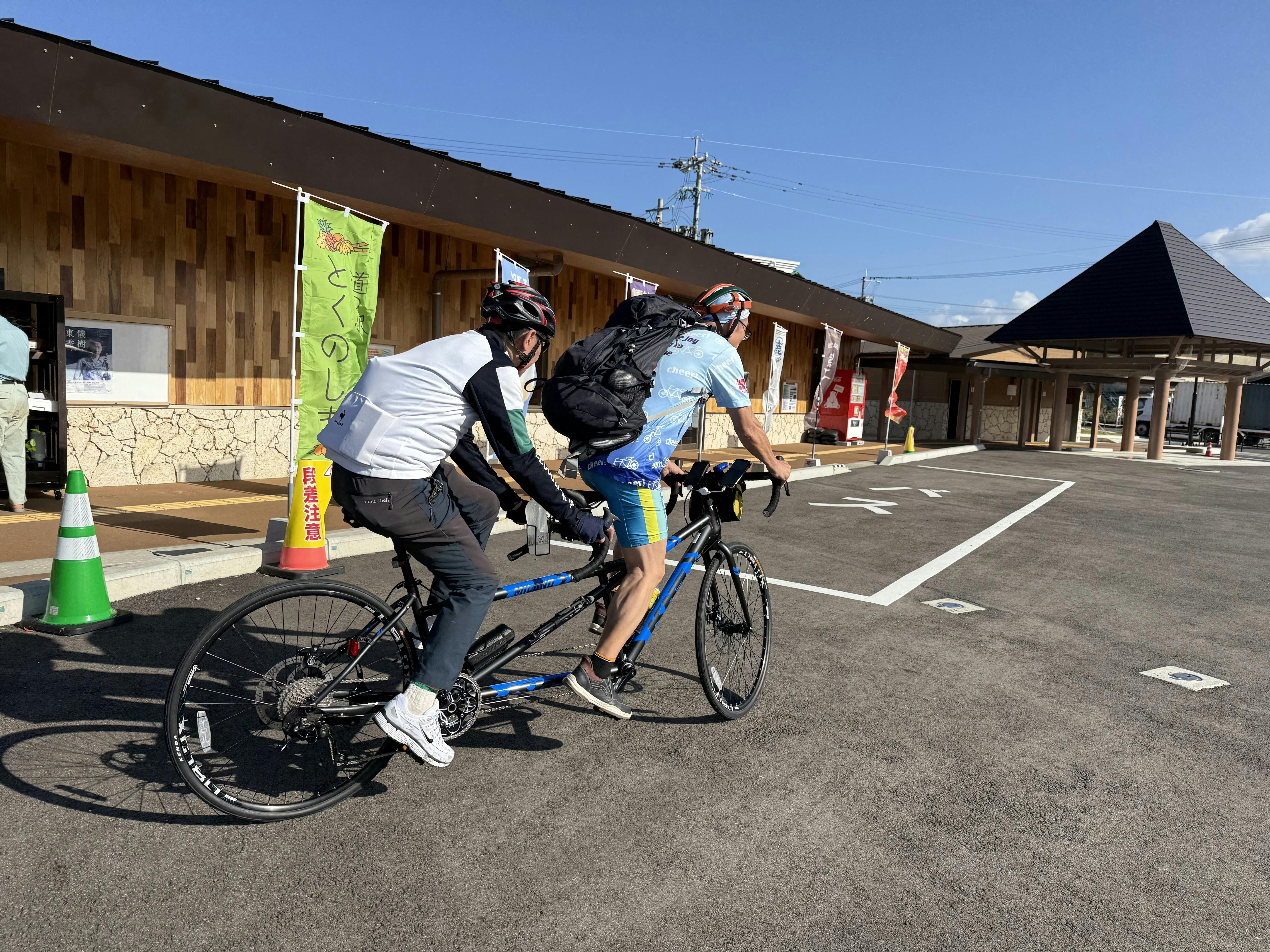 皆さまからのクラファン資金で購入したタンデム自転車。東京在住で視覚障がいをもつ野村耕一さんと、NPO活動法人サイクルボランティアジャパンの中西淳一さんに試乗していただきました。