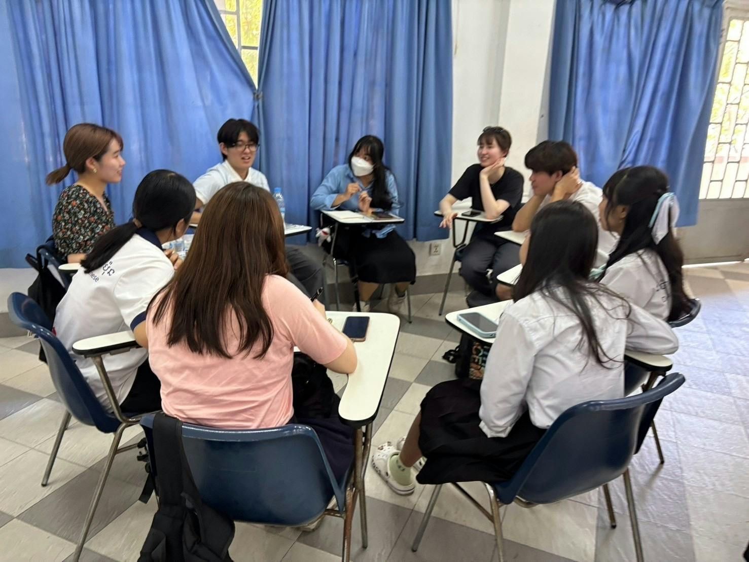 この日からプロジェクトが本格的にスタート〜午前中は王立プノンペン大学へ向かい、日本語学科の学生さんと交流しました!持ち寄った日本のお菓子や遊び道具を楽しみながら、たくさんお話しました。