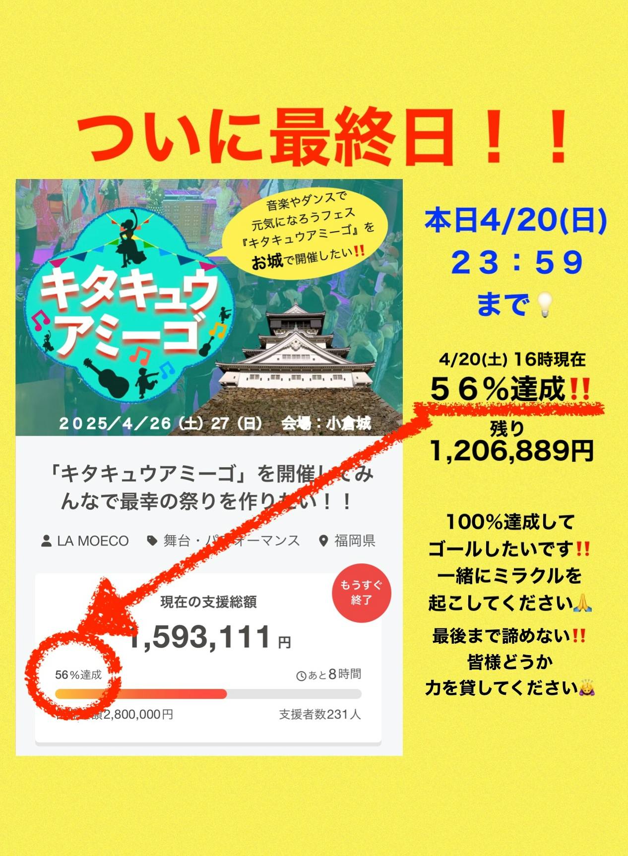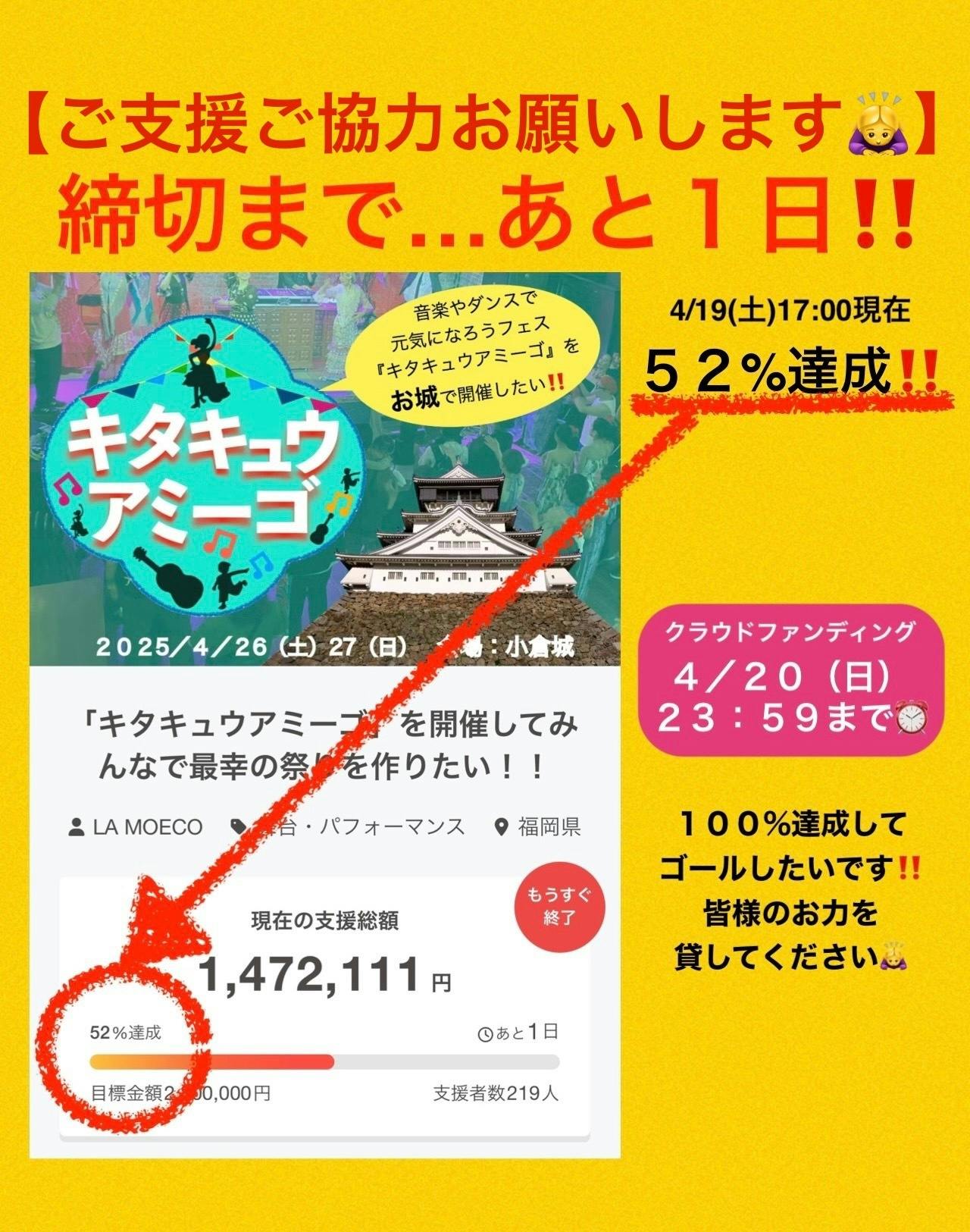 2025/04/19 18:29クラウドファンディング締切まで、ついに...あと1日〈4月20日(日)23:59まで〉となりました!!これまで沢山の皆様にご支援いただき、本当にありがとうございますm(__)m心より感謝しています。「キタキュウアミーゴ」開催に向かって、毎日本当に沢山の方からの応援をいただいているのですが・・・、実は目標達成率はまだ52%です。。※4月19日(土)17時現在クラウドファンディング終了までに100%達成してゴールしたいです!!どうか皆様のお力を貸してください!!クラウドファンディングの情報をシェアしていただけるだけでもありがたいです、、https://camp-fire.jp/projects/828881/view?utm_campaign=cp_po_share_c_msg_mypage_projects_show引き続き応援の程よろしくお願いいたします!! もっと見る
