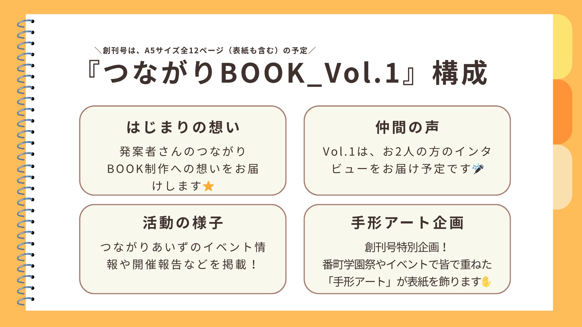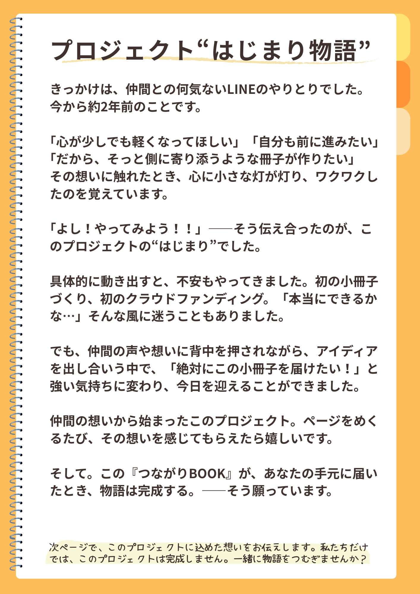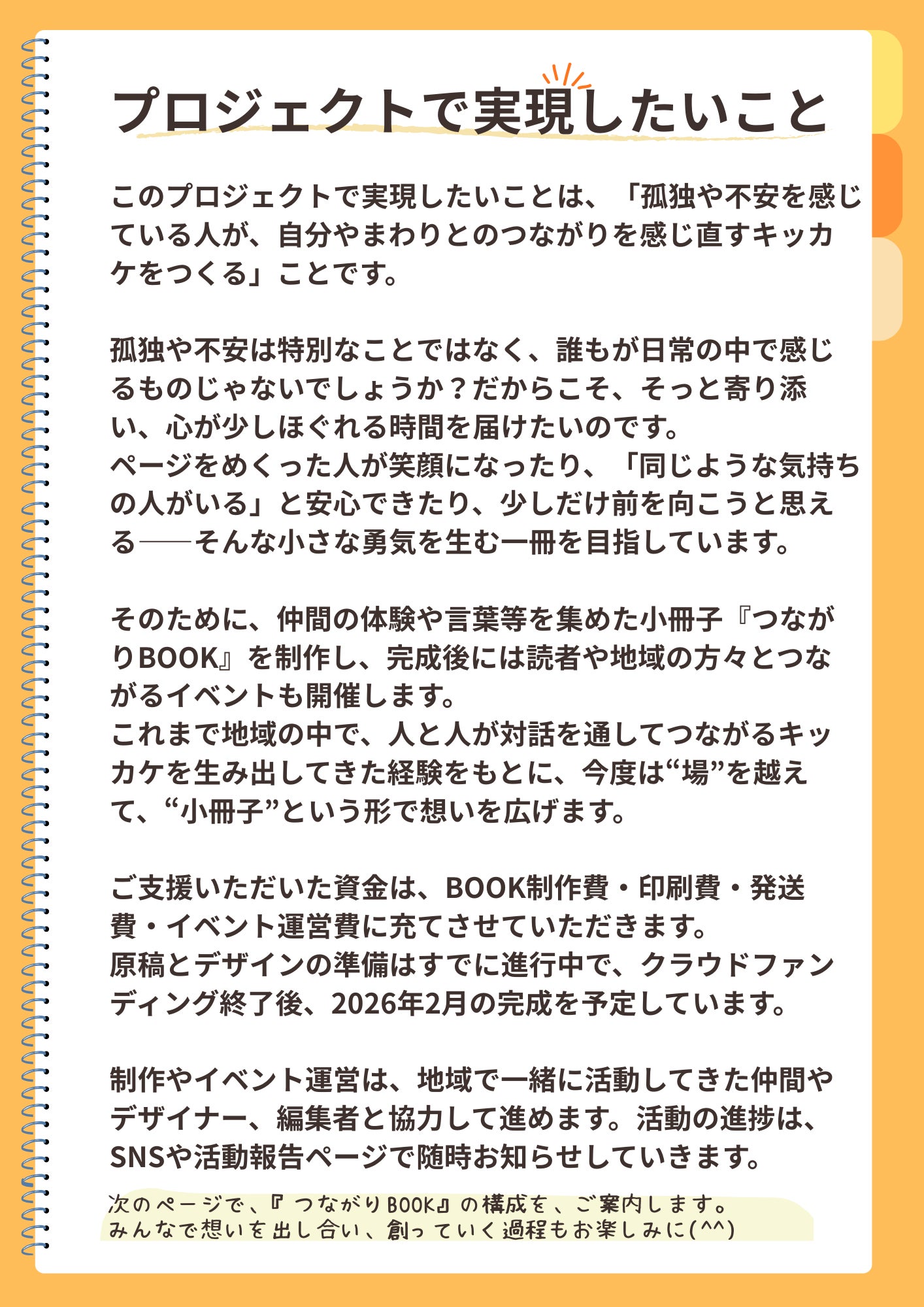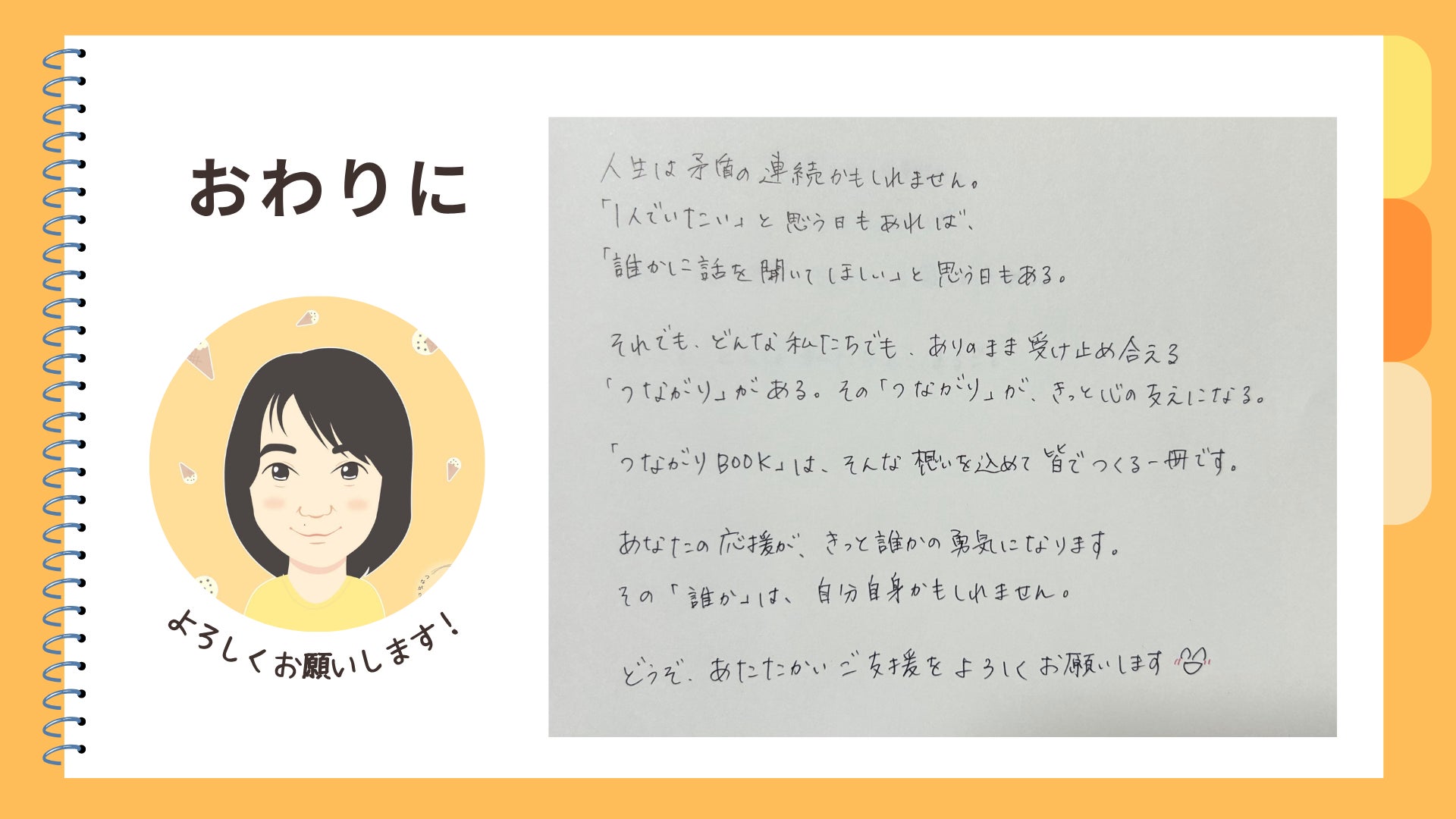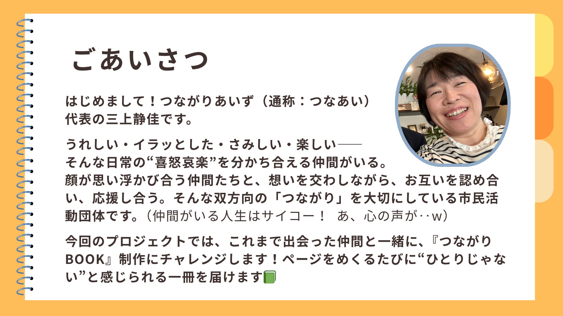 2026/03/28 11:25皆さま、こんにちは。【つながりBOOK】が皆さまのお手元に届き始め、続々と届く温かな感想に、制作部一同ホッと胸をなでおろしています。2年越しの想いを受け取ってくださり、本当にありがとうございます。制作部一同、「より良いものを」と心を込めましたが、素人ゆえに「ここをこうしたらもっと良かったかも!」という点も多々あるかと思います。 ですが、今回のプロジェクトは「誰かの想い」を「誰かの応援」で【形にする】ことが一番の目標でした。不器用な部分も含めて、皆さまと一緒にこの一冊を完成させられたこと。手前味噌ではありますが、まずは「達成」とさせていただきたいと思います。本当にありがとうございました!■もし、まだ届いていない方がいらっしゃいましたらお手数ですが、DMやメッセージで教えてくださいね。すぐに確認させていただきます。======さて、そんな「形にする」という一つの節目を終え、5周年を迎える2026年度。 「つなあい」は、これまでとは少し違うテーマの「オンライントーク会」から新しい一歩を踏み出します。今回のクラウドファンディングでご縁のあった皆さまにも、ぜひご一緒していただきたいので、ご案内させてもらいますね。実は代表の三上は昨年、大切な家族を看取る経験をしました。もうすぐ半年が経ちますが、心の中には今も言葉にできない想いがあります。「もっとこうすれば……」という後悔や、どうしても忘れたくない大切な景色。 普段は何事もないように過ごしていても、ふとした瞬間に心の中に雨が降る。そんな「言葉にならない悲しみ」を抱えながら過ごしています。もし、同じように大切な存在を見送った方がいらっしゃれば、その想いを安心できる場所で少しだけシェアしてみませんか?お別れから日が浅い方も、何年も経っている方も。 あるいは、まだお別れをしていないけれど、その時を想い心に留めておきたい方も。特別な準備はいりません。 ただ、心の中にある気持ちを、そっと置いていけるような穏やかな時間になればと思っています。●オンライントーク会「大切な人を見送った、あなたと」日時: 2026年4月25日(土) 10:00 〜 11:00場所: オンライン(Zoom)定員: 10名程度(参加費無料)お申込: 下記フォーム、または画像のQRコードより▶ https://forms.gle/EQBJWoLoZEyCmQ4VA※お申込いただいた方に、後日URLをご案内します。新年度も、皆さまと心でつながれる時間を大切に育んでいきたいと思います。 どうぞよろしくお願いいたします。つながりBOOK制作部(つなあい)より もっと見る【活動報告】春分の日の光とともに。皆さまの元へお届けが始まりました。