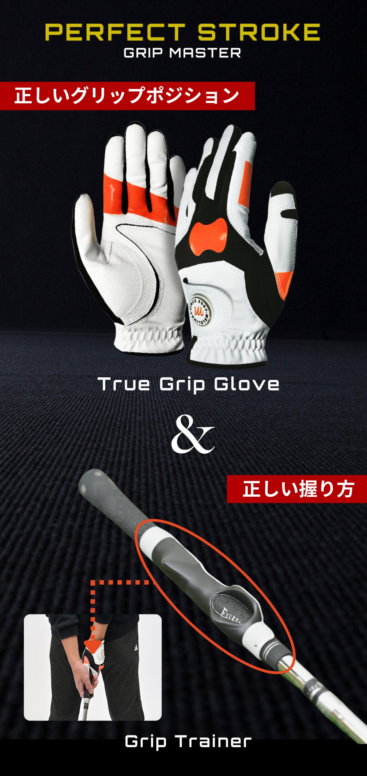 「パーフェクトストロークグリップマスター」はトゥルーグリップグローブが正しいグリップポジションを体に記憶させ、グリップトレーナーが正しい握り方を無意識に固定してくれます。