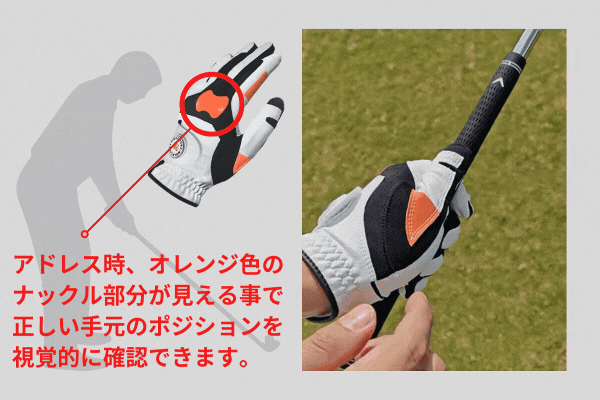 ナックル部分に施されたオレンジ色のガイドにより、アドレス時の正しい手のポジションが視覚的に一目で分かる設計。毎回安定したアドレスが可能になります。