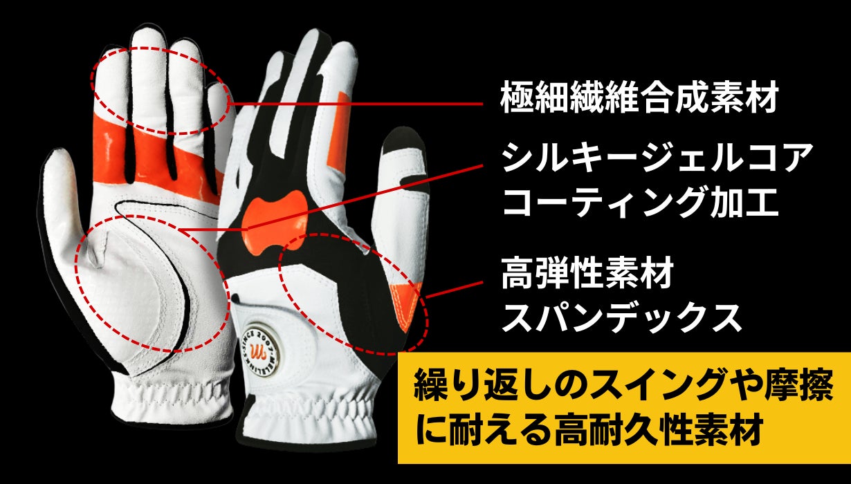 グローブの内側に施されたオレンジ色のラインが、クラブを正しくセットする位置を視覚的にガイドし、適切なポジションを保持します。