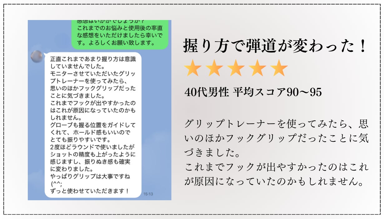 A:初心者から上級者まで、正しいグリップを習得してスイングの安定性を高めたいすべてのゴルファーにおすすめです。特に、自己流のグリップに悩む方や、スライス・フックが頻発する方に有効です。ご自身のグリップを見直すためにご使用いただいたモニターの方皆さまがショットの変化を実感していただきました。