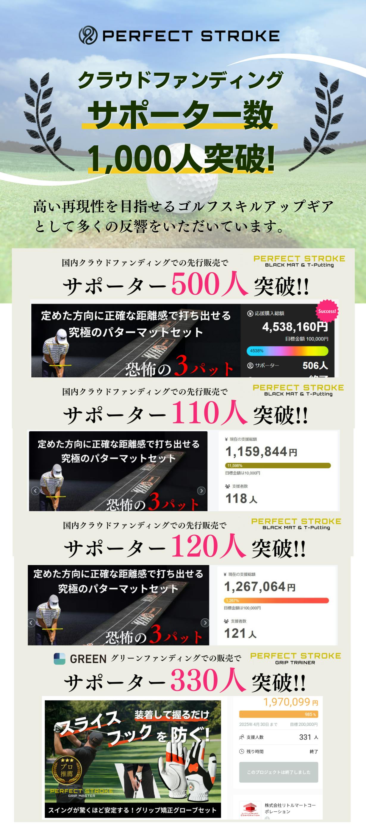 2025/07/02 12:05CAMPFIREでのプロジェクトが6月をもって終了いたしました。ご支援いただきました方にスタッフ一同、心から感激しております。本当にありがとうございます!今回ご紹介しました、グリップ矯正グローブセット「グリップマスター」は、ゴルフのスイングにおいて意外と見落としがちな"グリップ"に焦点をあてて製造メーカーと昨年より開発を進めて参りました。グリップはスイングの基礎であり、一番最初のスタート地点です。 「無意識のうちに正しいグリップを作る」これがその後の綺麗なスイングに繋がる第一歩です。今回のプロジェクトに際し、多くの方にモニターをお願いしましたが、モニターに参加した全員がグリップの重要性を実感することができました。「トゥルーグリップグローブ」と「グリップトレーナー」を使用して練習に取り組んでいただいた全てのゴルファーの皆さまのスキルアップに少しでもお役に立てましたら幸いです。製品の方は、既に発注を行っております。到着次第、速やかに出荷を進めて参ります。7月下旬には全てのご支援購入者の皆さまにお届けできますよう手配して参ります。お届けまでお時間を頂戴しますが、楽しみにお待ちいただけましたらと思います。「PERFECT STROKE」はゴルフのスキルアップを目指すブランドとして、プロコーチやプロゴルファーの方々とも連携しながら、これからもお役に立てる練習用品をシリーズ化し展開して参ります。ゴルフを愛する皆さま方のスキルアップをスタッフ一同心より願っております。本当にありがとうございました。今後ともご愛顧の程何卒よろしくお願い申し上げます。 もっと見る【残りあと6日】Yahoo!ニュースに掲載されました!