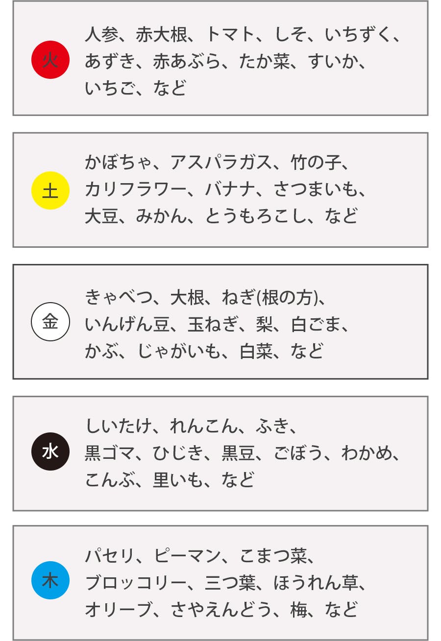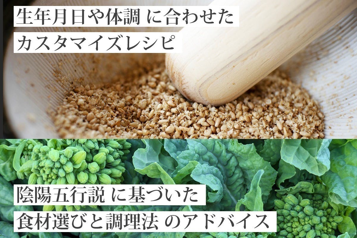 季節や個人の体質に合わせて、木・火・土・金・水の5つの要素のバランスを考慮した食材選びや調理法をアドバイスします。