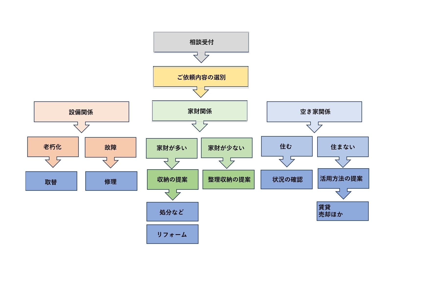 一般的なリフォーム業者は、大規模な改修や設備更新に特化しておりますが、私共は「家の中に込められた思い出やストーリーを大切にし、その後の生活がよりよくなるように」、家の整理、活用を総合的にサポートしていきます。
