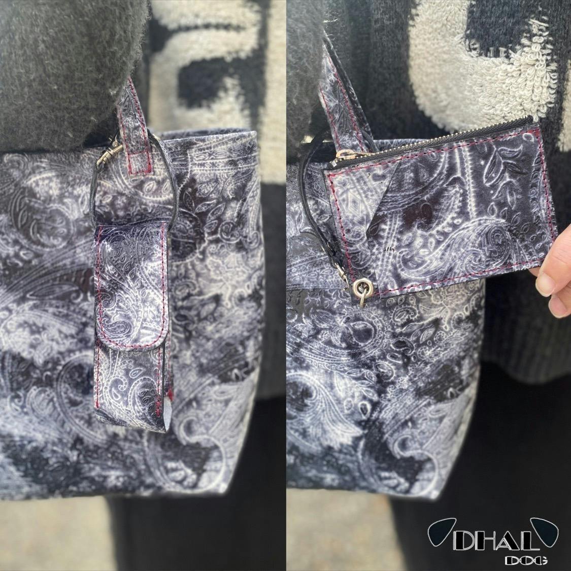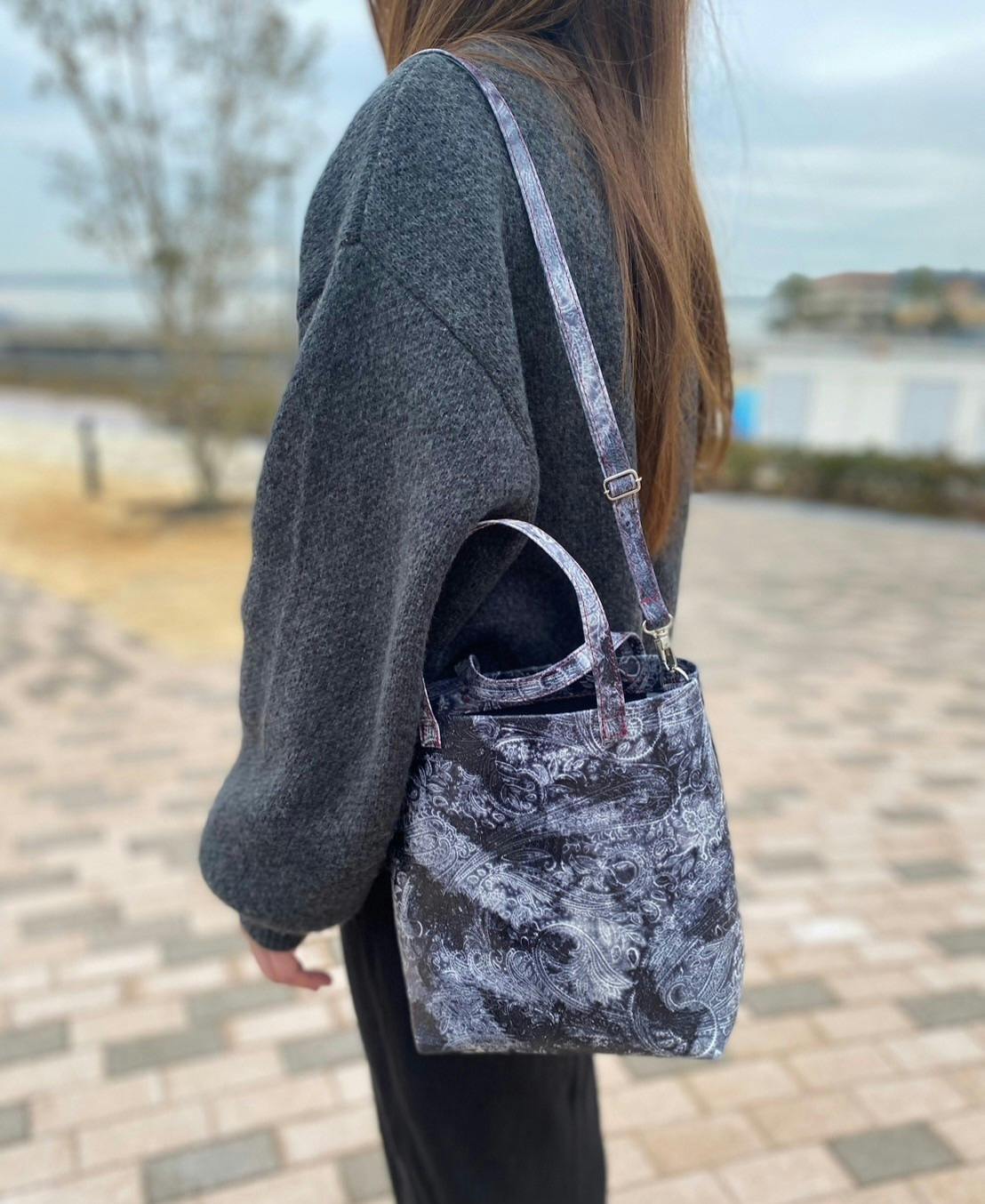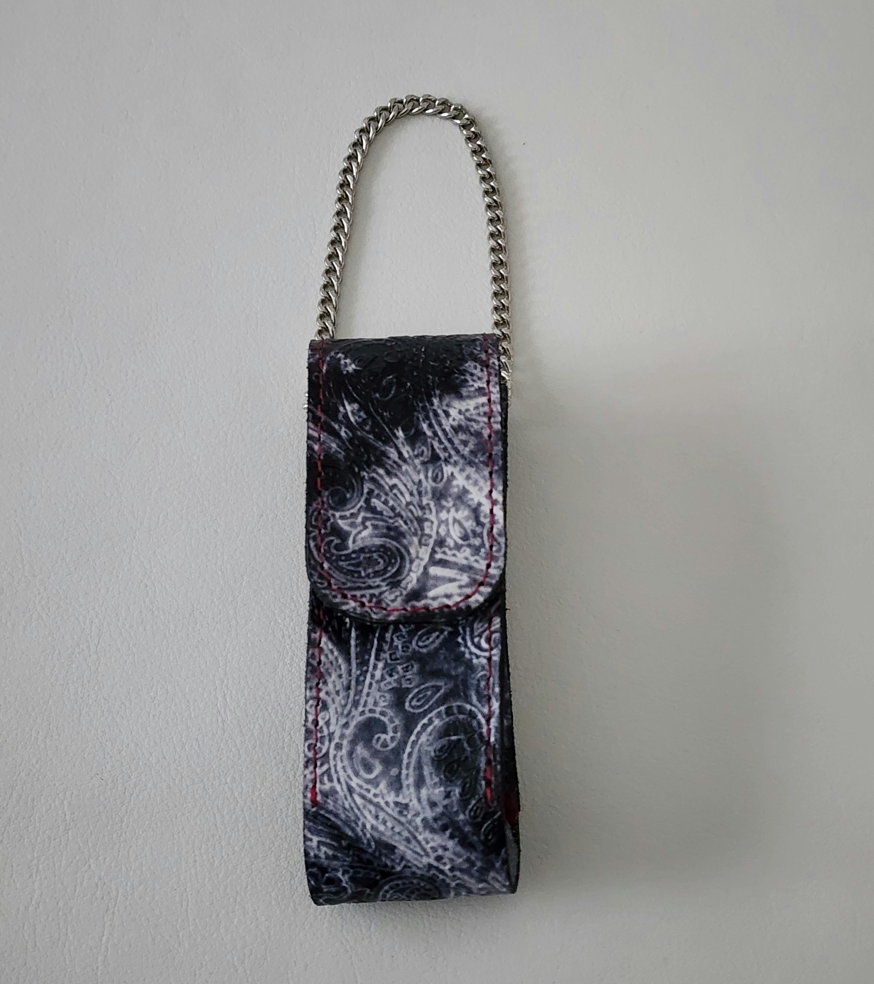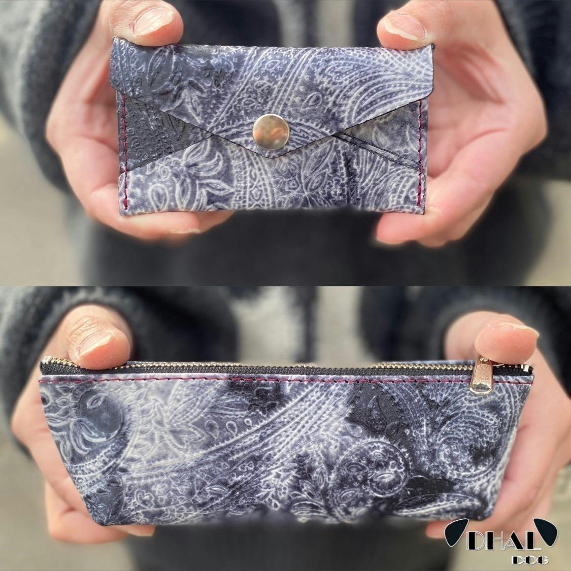 デットストックとなっている皮に、かわいいペイズリーの型を押します。次に黒く塗料を吹いて乾いたら、ここからが、「こだわりの手作業」がはじまります。職人のセンスが問われる工程。ある薬品をかけると黒い部分が、白くなっていきます。白と黒のバランスをとりながら薬品をかけて丁寧に仕上げていきます。同じ皮が出来ることはなく、1枚の皮の中でも同じ表情の部分はありません。皮も耐久性を考え、できるだけ薄く漉きをかけ、軽くて丈夫な厚さを考えてます。