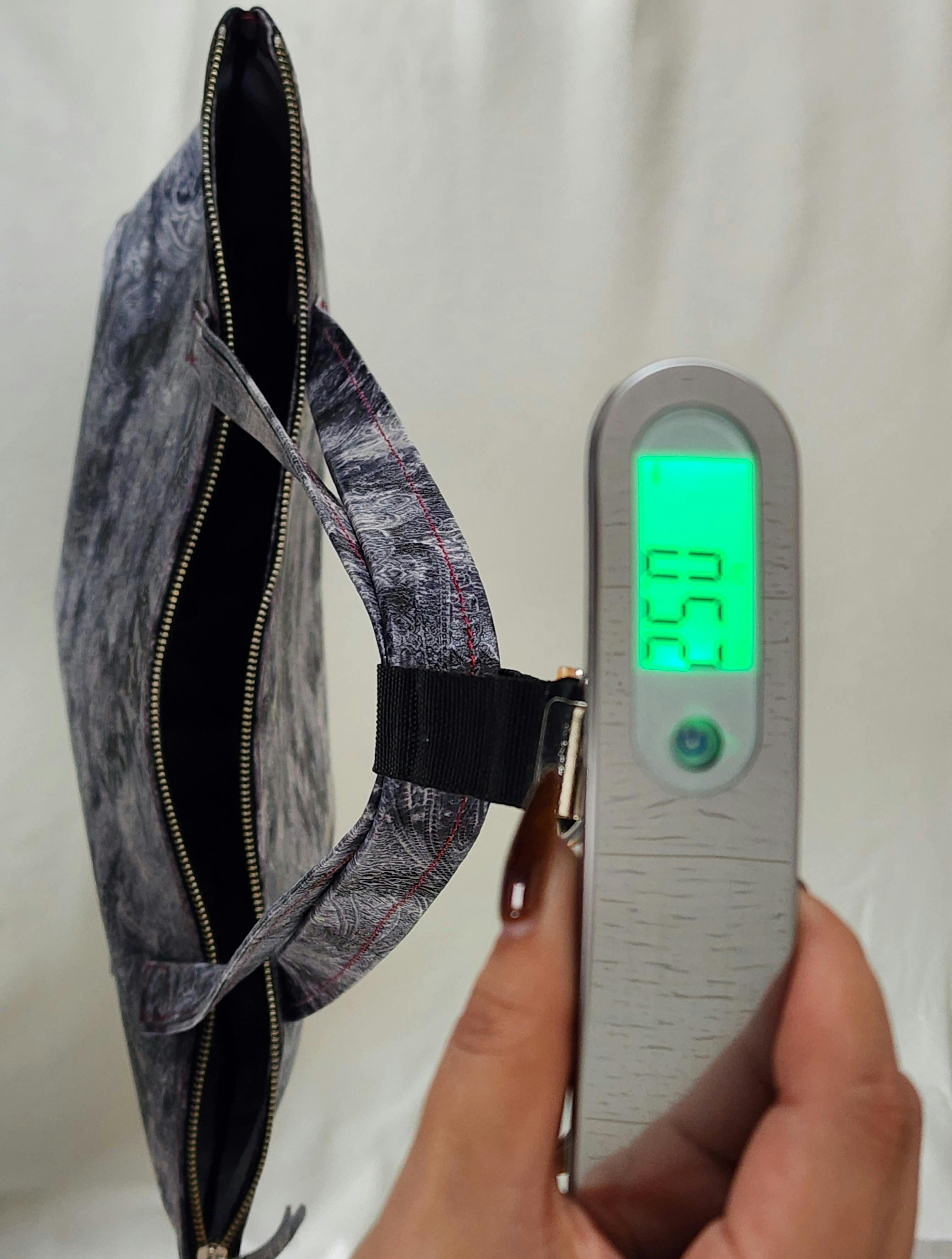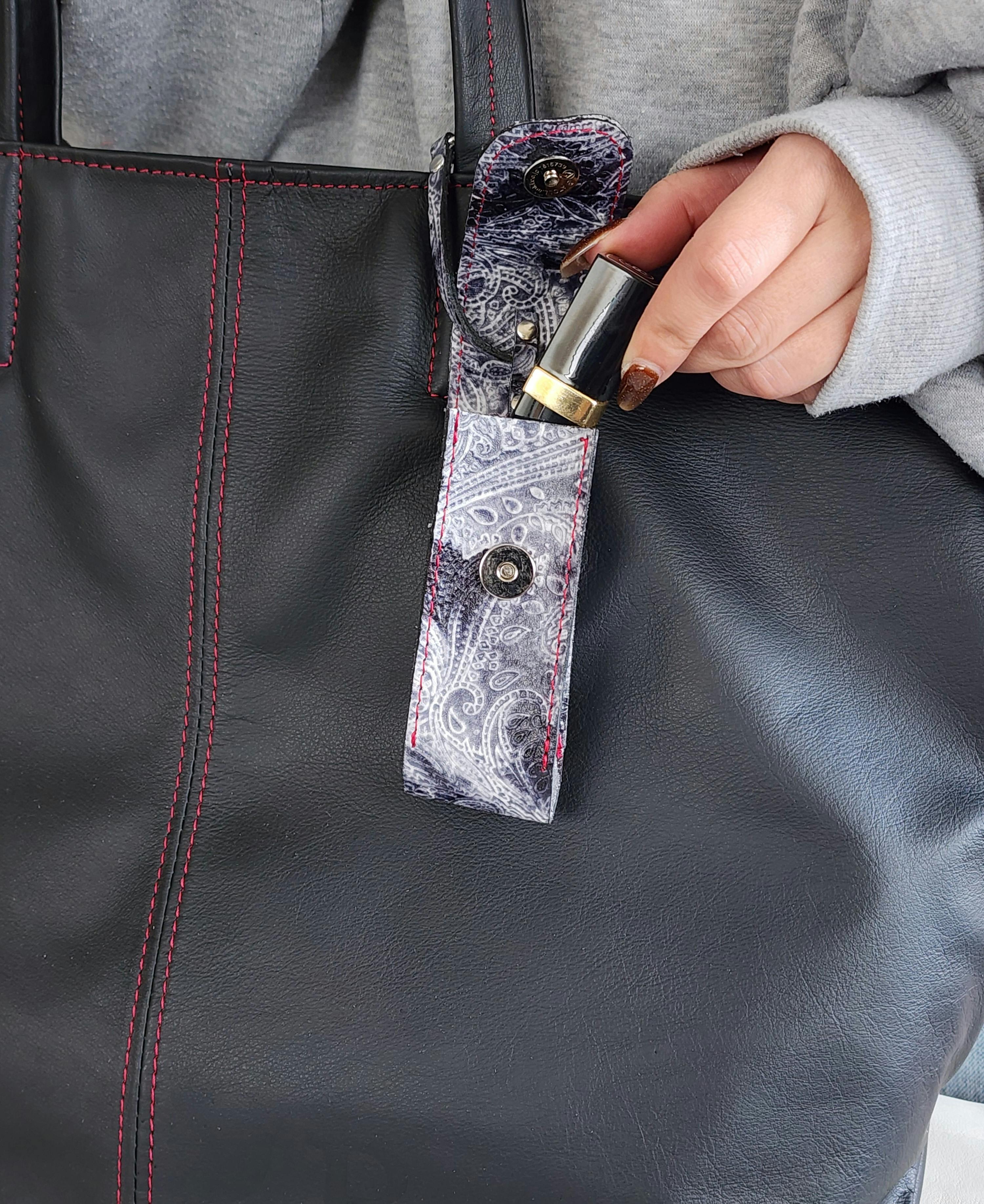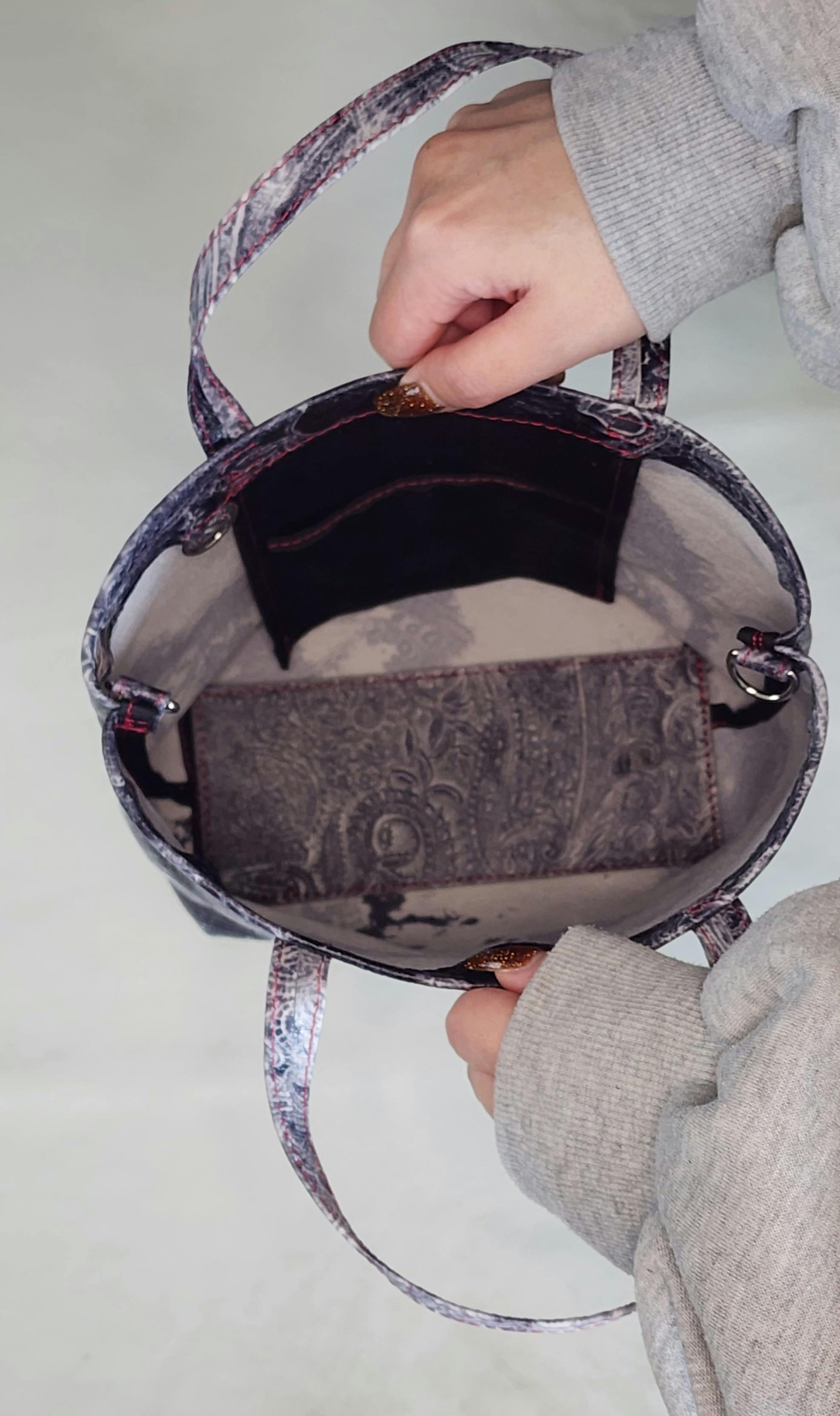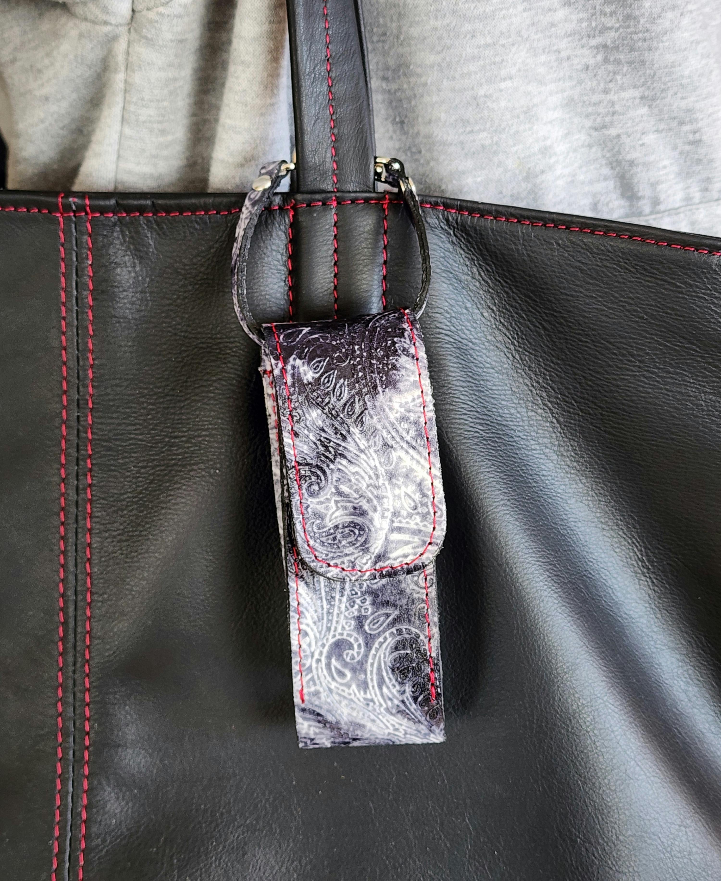 デットストックとなっている皮に、かわいいペイズリーの型を押します。次に黒く塗料を吹いて乾いたら、ここからが、「こだわりの手作業」がはじまります。職人のセンスが問われる工程。ある薬品をかけると黒い部分が、白くなっていきます。白と黒のバランスをとりながら薬品をかけて丁寧に仕上げていきます。同じ皮が出来ることはなく、1枚の皮の中でも同じ表情の部分はありません。皮も耐久性を考え、できるだけ薄く漉きをかけ、軽くて丈夫な厚さを考えてます。