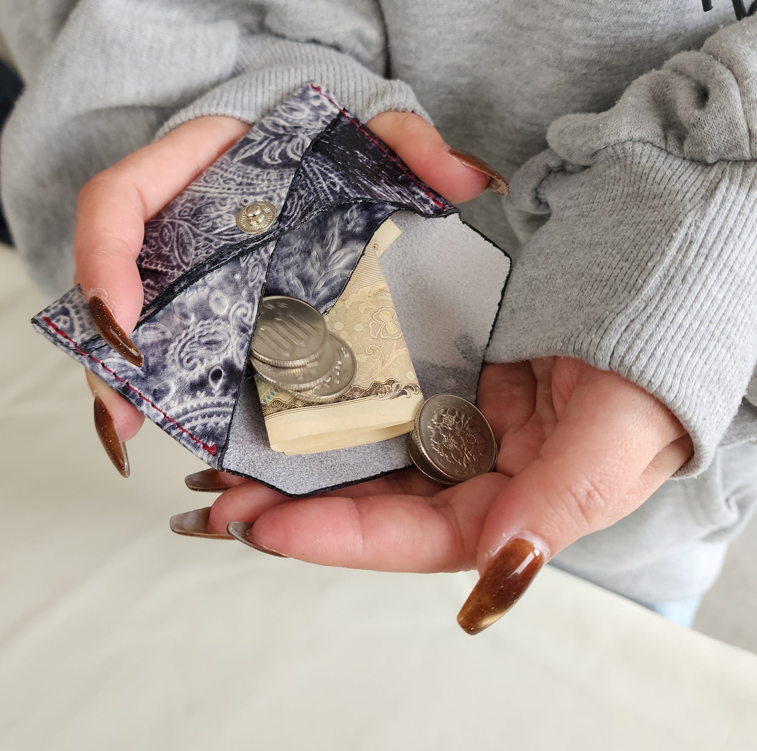 ・真ん中にしきりがあり、紙幣、小銭、カードも収納できます。