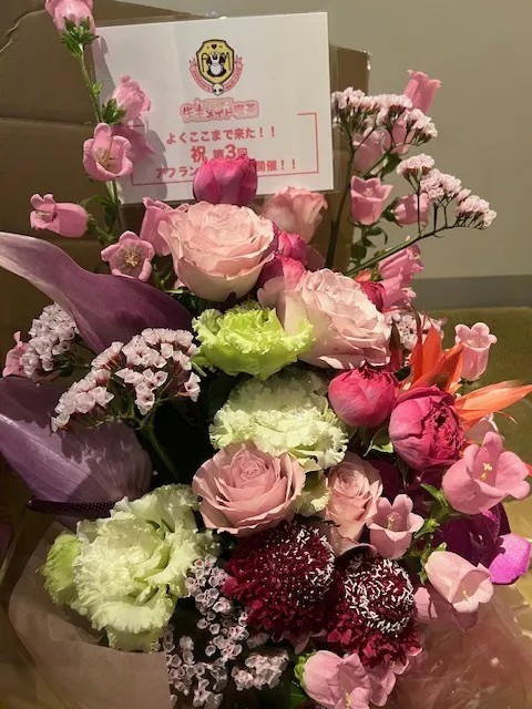 1部はメイド喫茶、2部はコスプレ喫茶という形態で開催し、たくさんのリスナーさん(県外から来ていただいた方もいました)がご来店していただき、お祝いの花や「楽しかった」「来年もやって欲しい」等の言葉を頂きました。