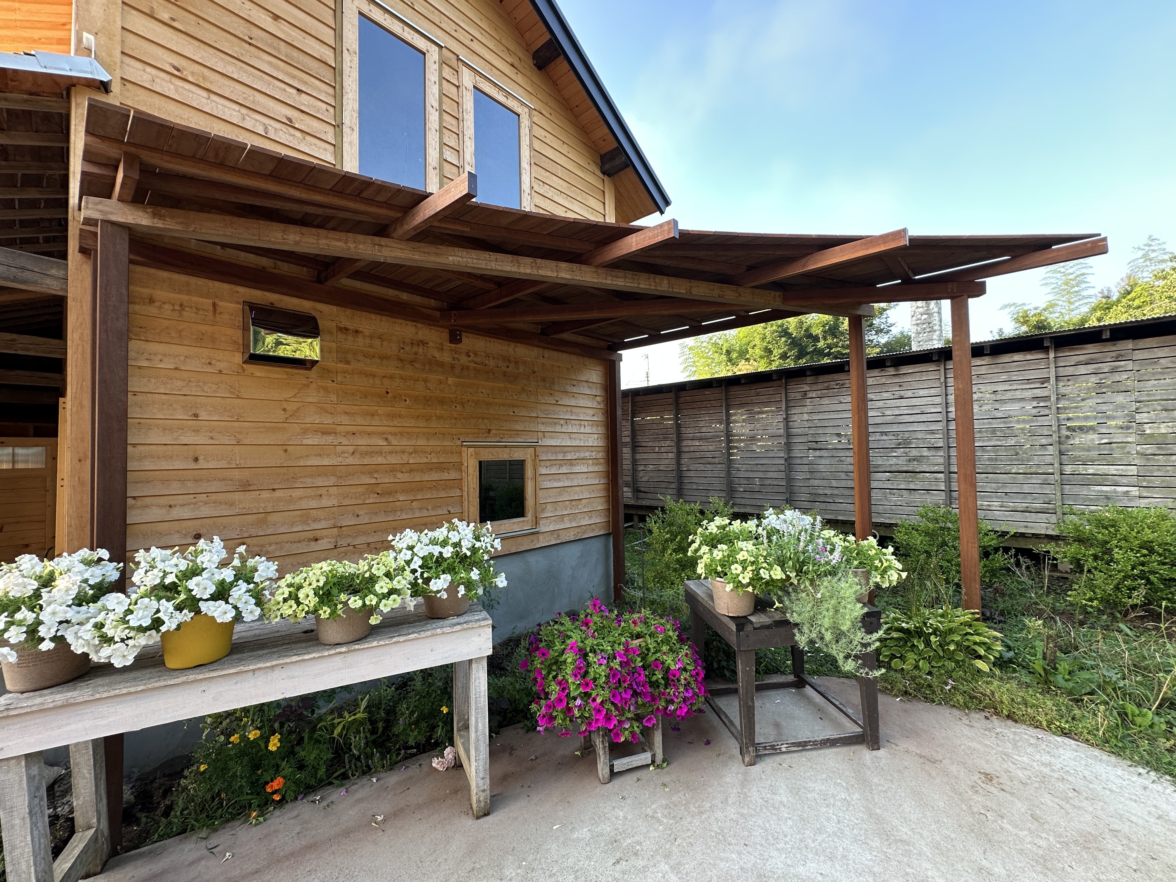 資材加工等で追原で過ごす時間が増え、燻製やピザ作りにはまり、土地が余っていましたので、ピザ窯や燻製づくりの場所も作りました。最初は親しい人達に配っているだけでしたが、いろいろな人達に食べてもらいたいと思い、週末限定でカフェを営業していました。それと同時に、敷地内に大好きなガーデンいじりをするためにコツコツと花木を増やしてきました。