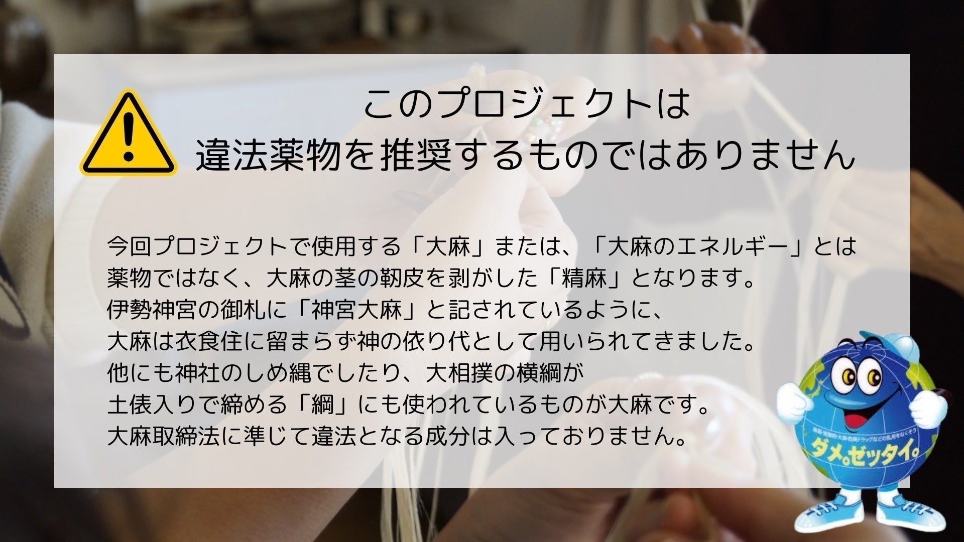 ※今回プロジェクトで使用する「大麻」または、「大麻のエネルギー」と表しているものは、違法なものを示しているものではございません。薬物ではなく、大麻の茎の靭皮を剥がした「精麻」です。伊勢神宮の御札に「神宮大麻」と記されているように、大麻は衣食住に留まらず神の依り代として用いられてきました。他にも神社のしめ縄でしたり、大相撲の横綱が土俵入りで締める「綱」にも使われているものが大麻です。大麻取締り法に準じて違法となる成分は入っておりません。