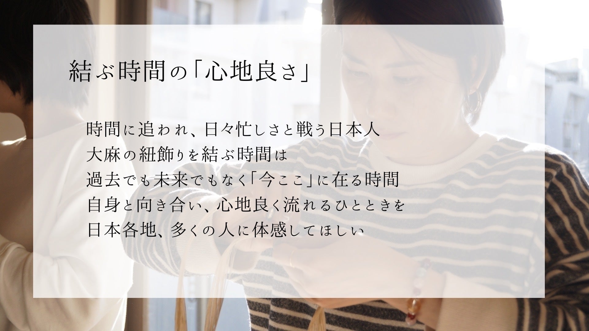 大麻の紐飾りに関しては、日本の地で丁寧につくられた精麻を使用し、紐飾りの販売と共に、紐飾りを結ぶワークショップの開催もしていきます。プロジェクトメンバーの中には20年以上海外在住でいる方もいるので、伝えたい言葉のニュアンスなどを擦り合わせながら、言葉の壁もなく、想いの誤差もなく海外展開していけるよう活動していきます。