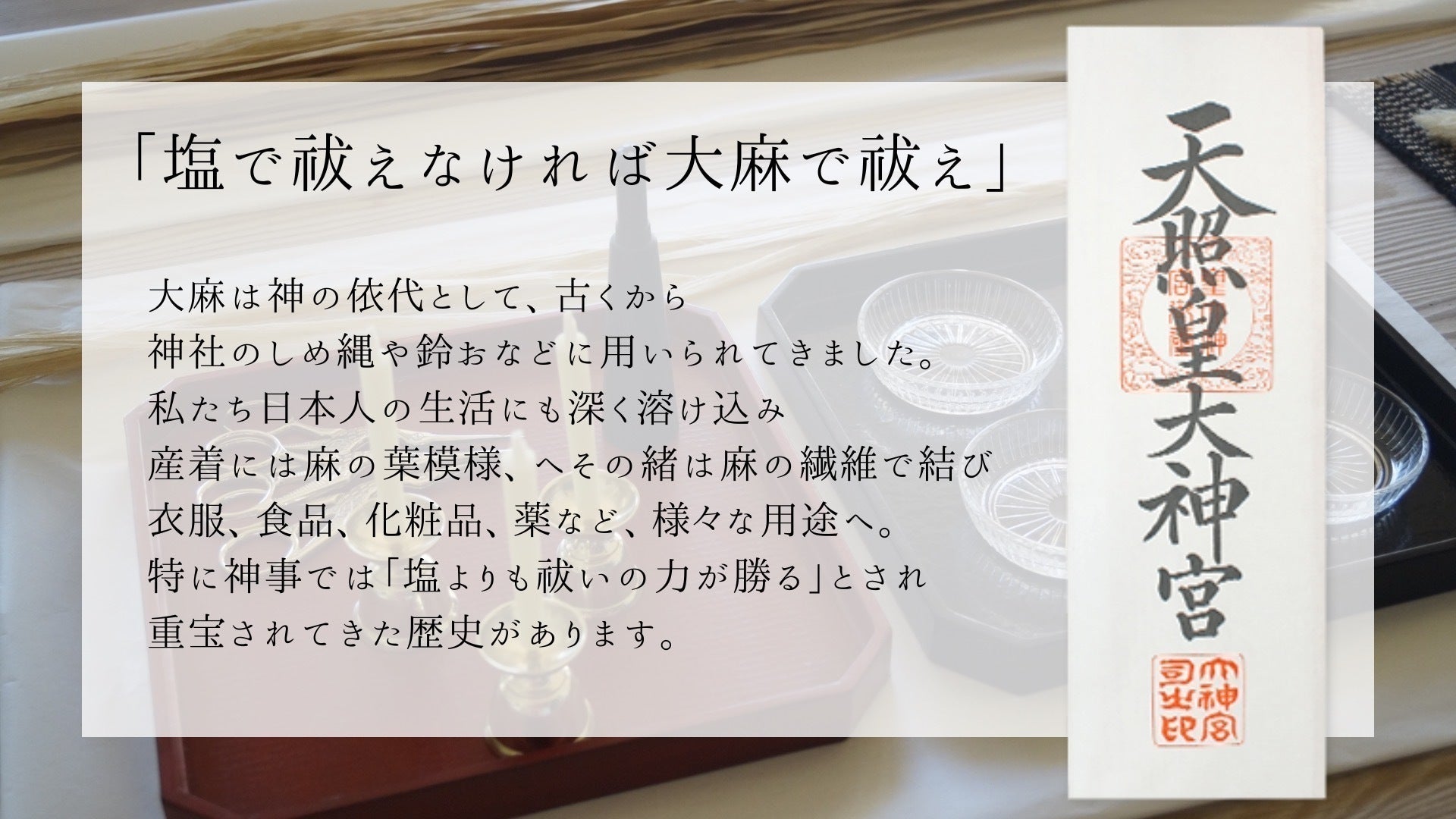 衣食住、古来より日本人の生活と共にあった大麻は神事にも使用され、「塩で祓えないものは大麻で祓え」と言い伝えられるほどエネルギーの高いものだったと聞きます。