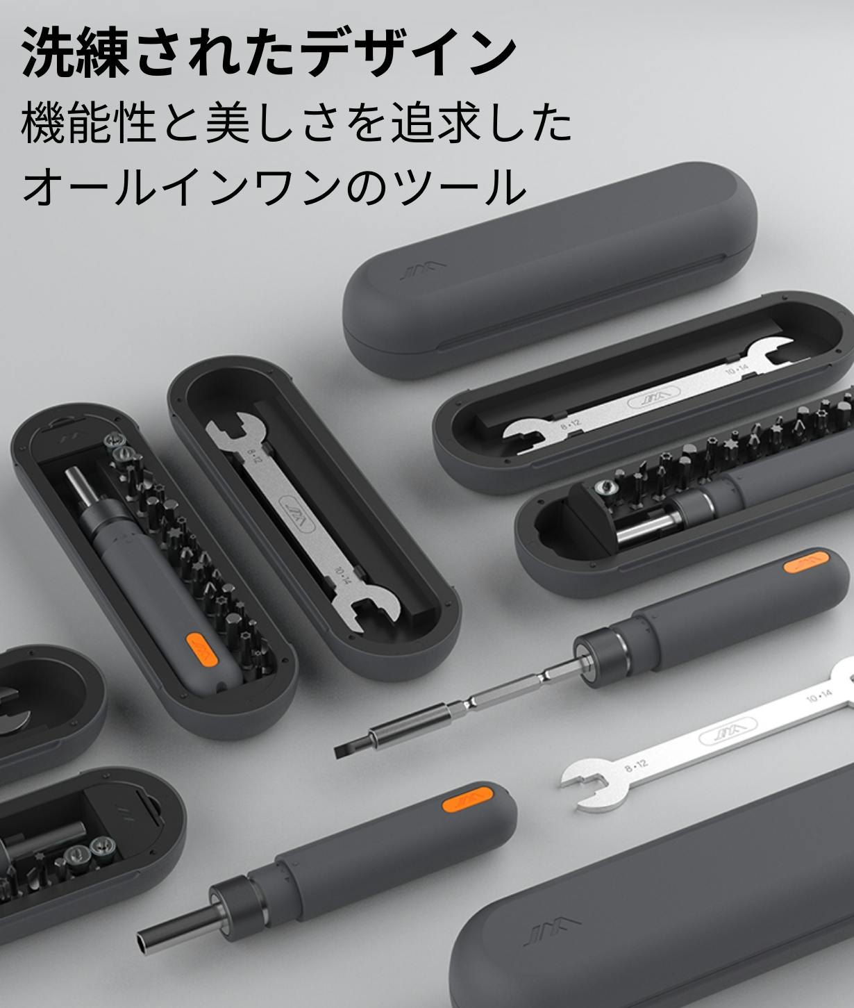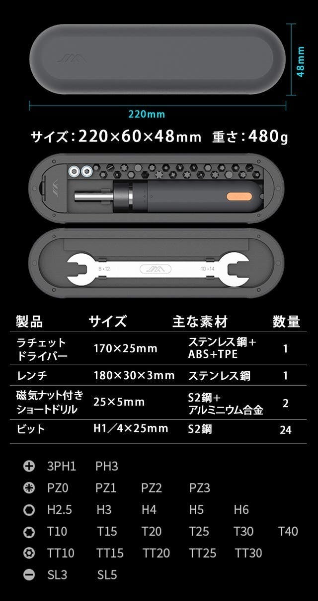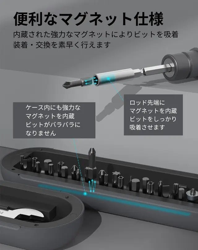 本体やビットの素材には高品質なステンレス鋼、ABS、TPEなどが使用されており、優れた耐久性だけでなく品のある高級感も備えています。ドライバー本体のハンドルは使い心地や握りやすさを追求して設計されているので手によくなじみフィットします。シンプルかつコンパクト化を目指したケースにはネジ収納スペースも備わっており、作業に使用するネジを紛失する心配もありません。