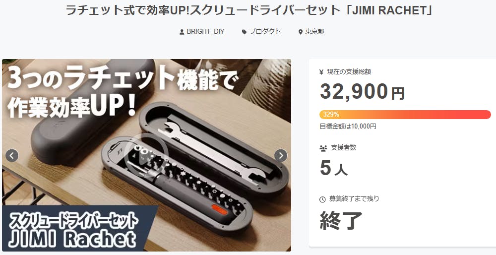 2025/06/01 00:18ご支援者様、ラチェット式で効率UP!スクリュードライバーセット「JIMI RACHET」にご興味をお持ちいただきありがとうございます。プロジェクト開始から40日目で5人ものご支援者の方々より支援頂き、無事プロジェクト終了を迎えることが出来ました。早速皆様のリターンを2025年06月末にお届けできるよう準備を始めております!皆様にご満足いただけるリターンをお届けできるよう、全力で取り組んで参りますので引き続き、「ラチェット式で効率UP!スクリュードライバーセット「JIMI RACHET」」をよろしくお願い致します。BRIGHTチーム もっと見る