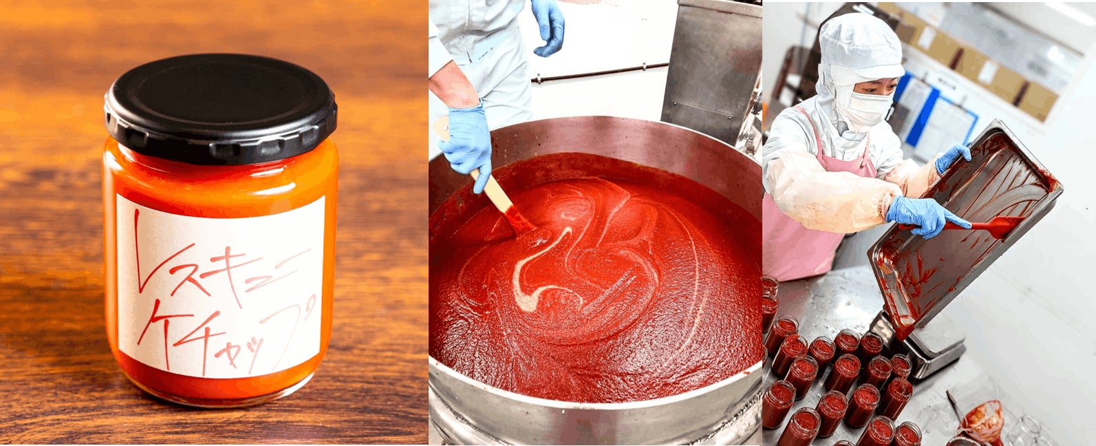 廃棄予定のトマトピューレ430㌔をレスキュー。そのままでも、もちろん美味しい、でも大量に使うことは難しい。長く広く、このトマトピューレが届くようにケチャップを考案。じんわりと炒めた玉ねぎの甘さと奥行きを塩は沖縄の天然塩、砂糖ではなく甜菜糖を使い、スパイスはトマトの甘みと爽やかさの奥にほんのりと香る感覚にし、さらに隠し味に昆布と和辛子を使用。
