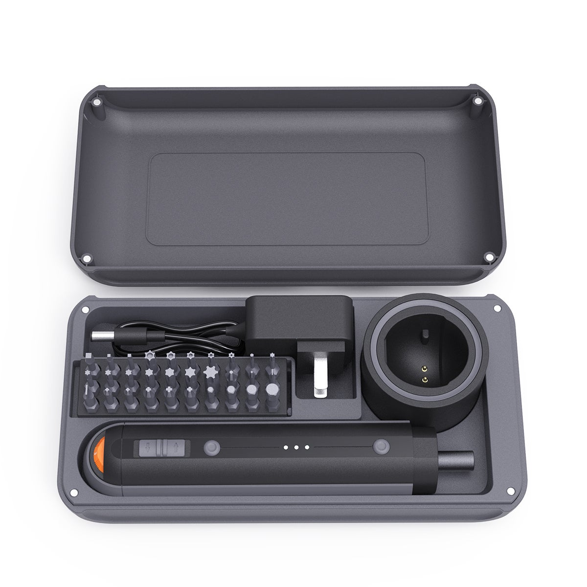 コンパクトなケースに、驚きの機能が詰まっています。ケースサイズはわずか220x115mmで、驚くほどスリムな設計。それでいて、8つのツールと30種類ものビットを収納できるのです。作業用ズボンのポケットや仕事用の鞄にもすっぽり入り、持ち運びも簡単です。