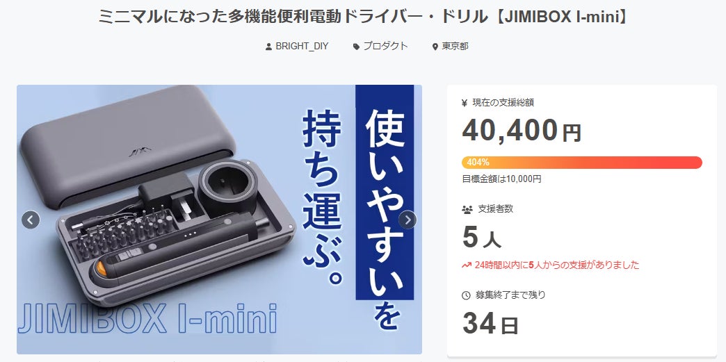 この度は「ミニマルになった多機能便利電動ドライバー・ドリル【JIMIBOX I-mini】」に支援 頂き誠にありがとうございます!お陰様で、開始から10分経たずに10万円の目標金額を100%達成することができました。ご興味のある方、ぜひ支援お願い致します。https://camp-fire.jp/projects/829077/viewBrightチームは、当プロジェクトをもっと多くの方に知っていただきたいと考えております。よかったら、FacebookやTwitter等のSNSでのシェア・拡散をお願い致します。#brightdiyどうぞよろしくお願い致します。Brightチーム