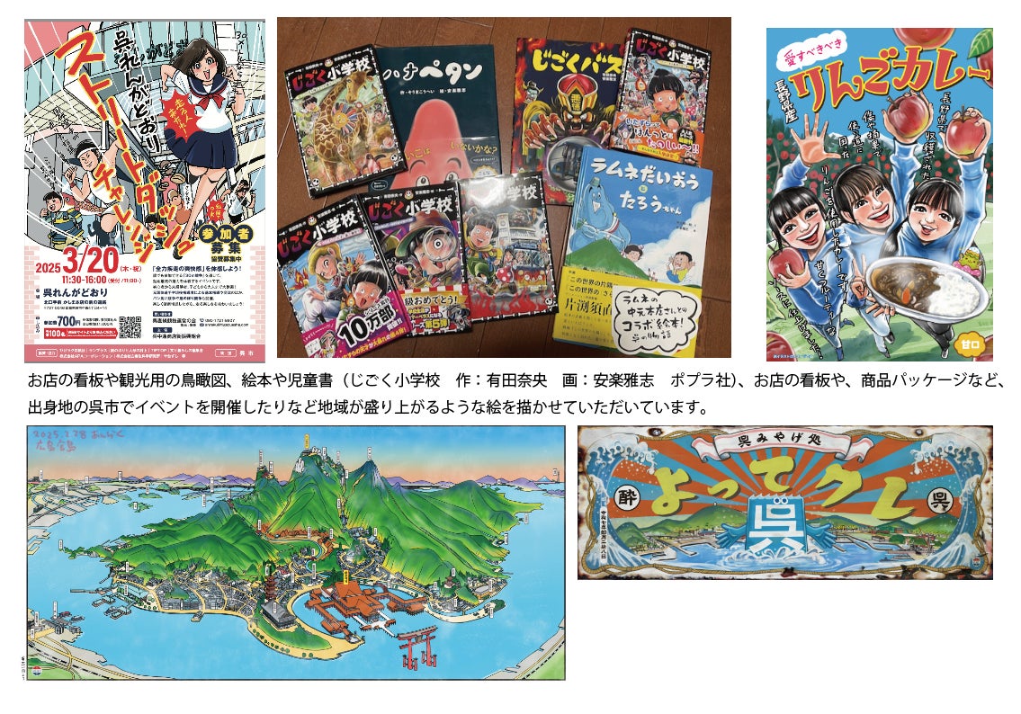 呉市出身、名古屋市在住。昭和レトロな懐かしくユーモアあるイラストで飲食店の看板やポスター、トリックアートや鳥瞰図、絵本や挿絵を描く。パリで個展、東京都庁最上階に「東京観光眺望図」常設設置。児童書「じごく小学校」(作:有田奈央 画:安楽雅志 ポプラ社)シリーズ13万部突破。「呉大博覧会」のロゴ作成。2025年3月呉市中通商店街にて「呉れんがどおりストリートダッシュチャレンジ」と銘打って商店街を走ってもらうイベントを実施。好評を得る