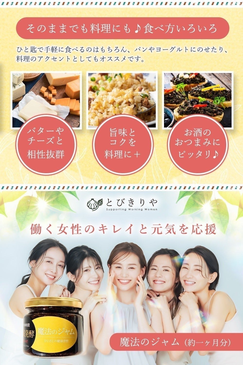 と思い、このプロジェクトを立ち上げました。ただでさえ美味しい糖度54度のジャンボ甘黒にんにくを、さらに美味しくオリゴ糖・キビ糖・蜂蜜で食べやすくした「魔法のジャム」です。