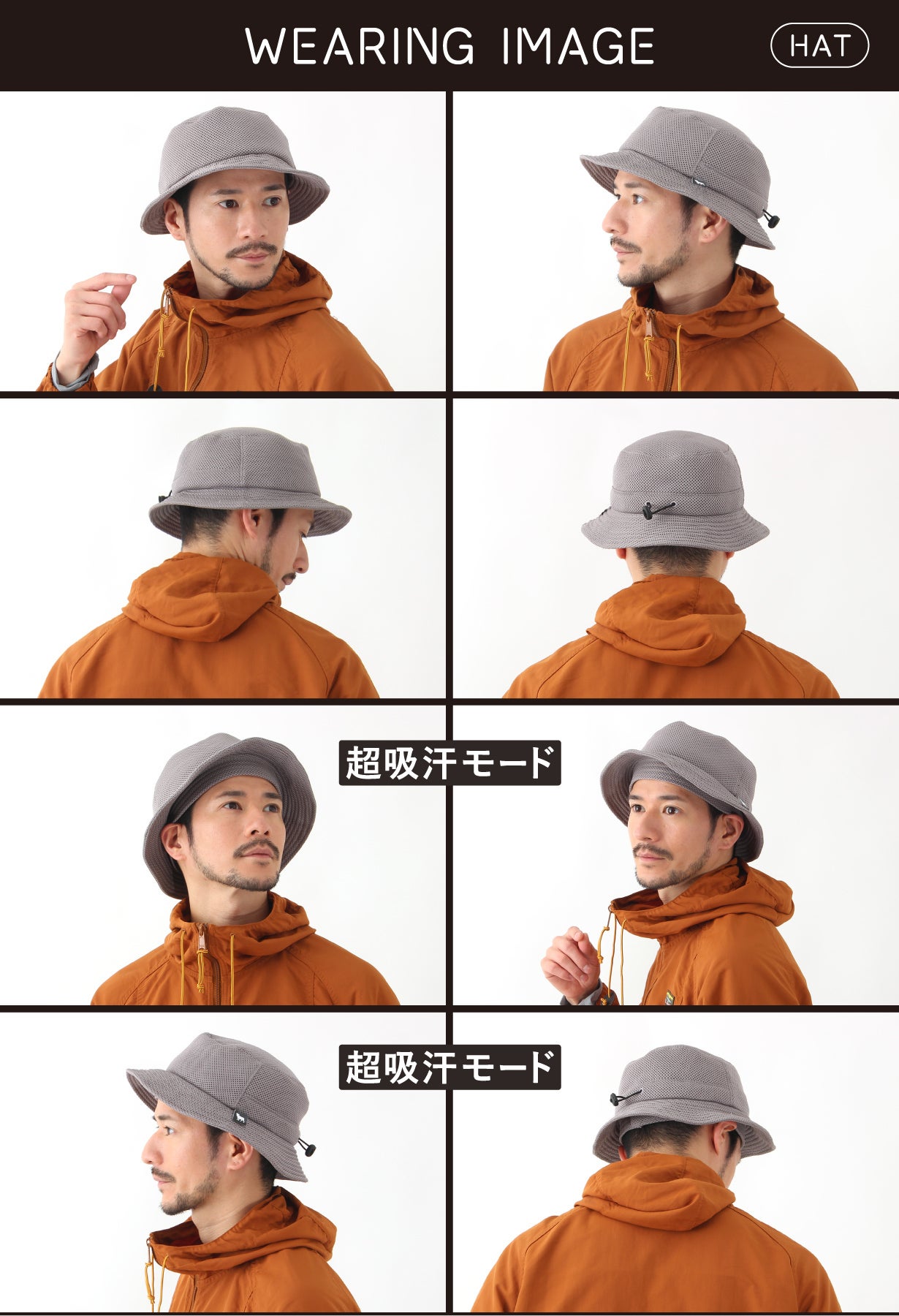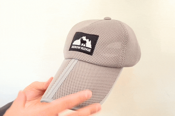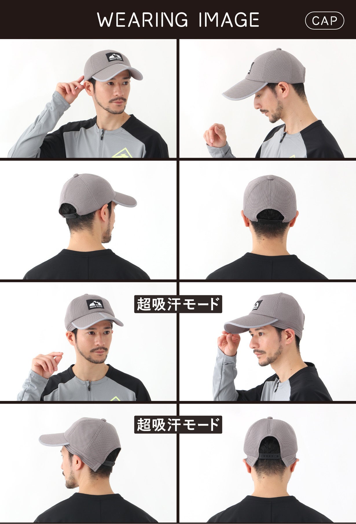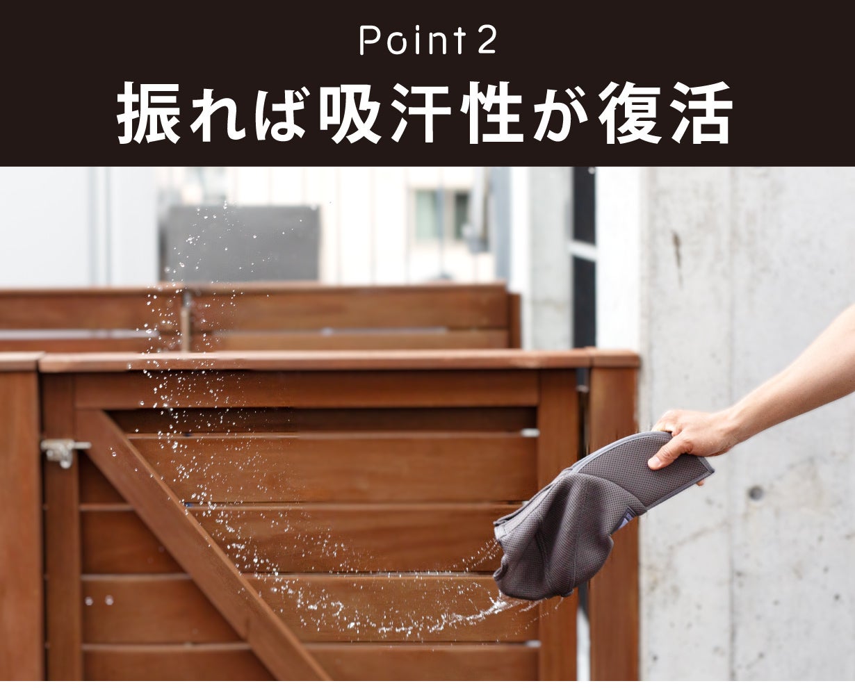 汗をかいて湿った帽子は振るだけで、ある程度の水分を飛ばすことができます。水分が減ると通気性の高いメッシュ生地の効果で帽子を被った時に涼しく感じるのも特徴です。