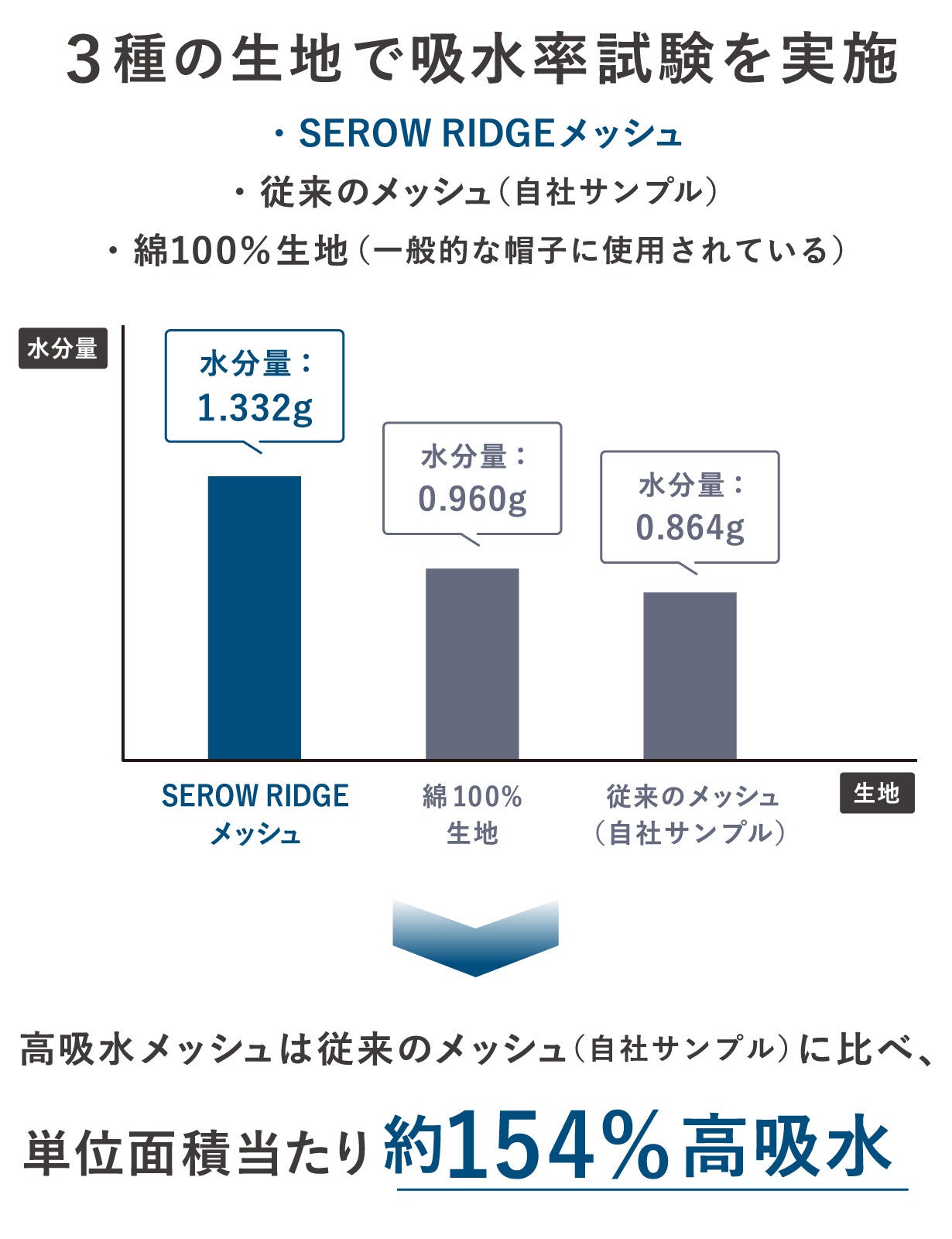 同じ面積当たりで吸水した水の量の比較して、「SEROW RIDGEメッシュ」は「従来のメッシュ(自社サンプル)」に比べ、単位面積当たり約154%高吸水、「綿100%生地」 と比較しても約138%も高吸水という結果が出ました。