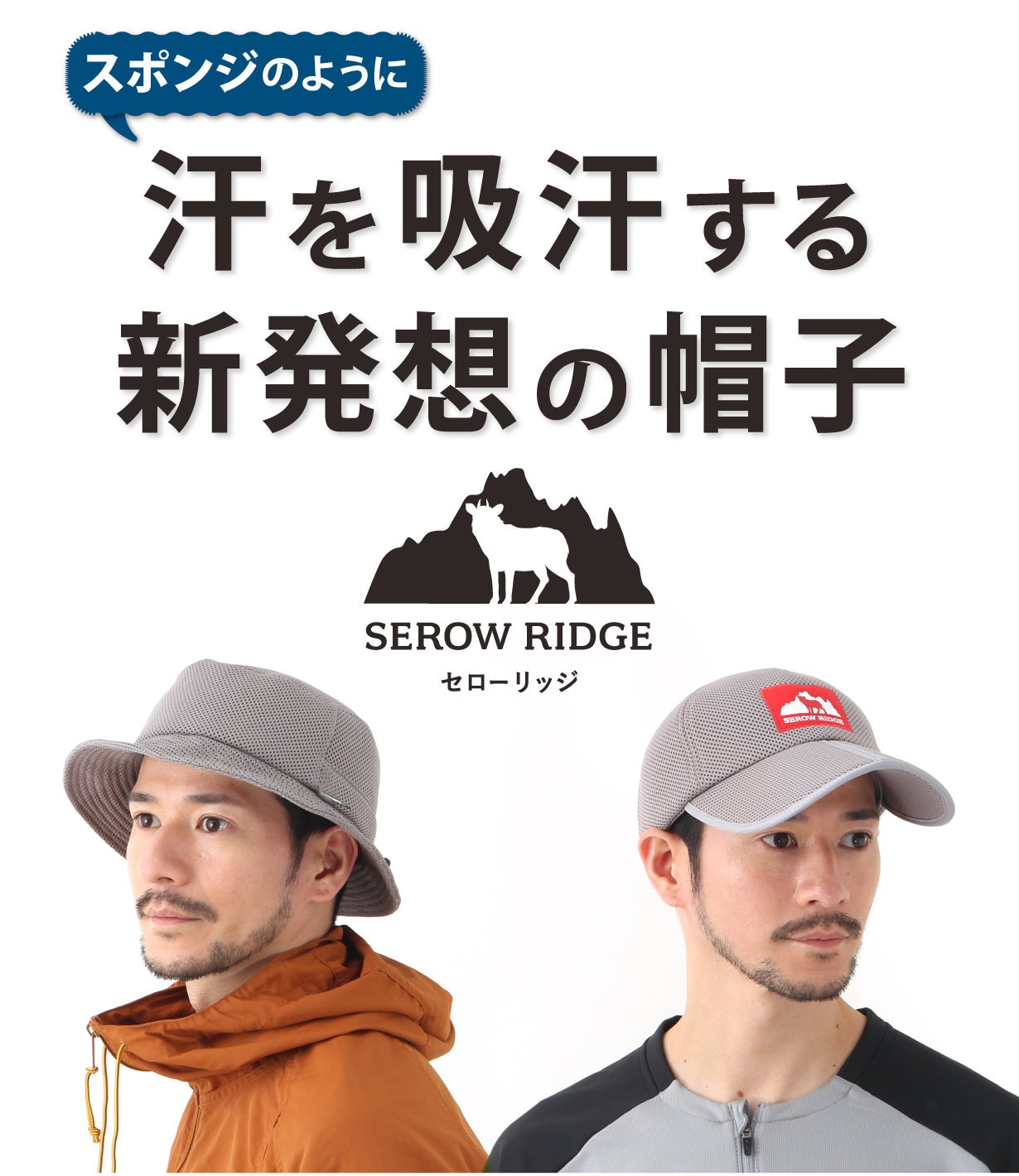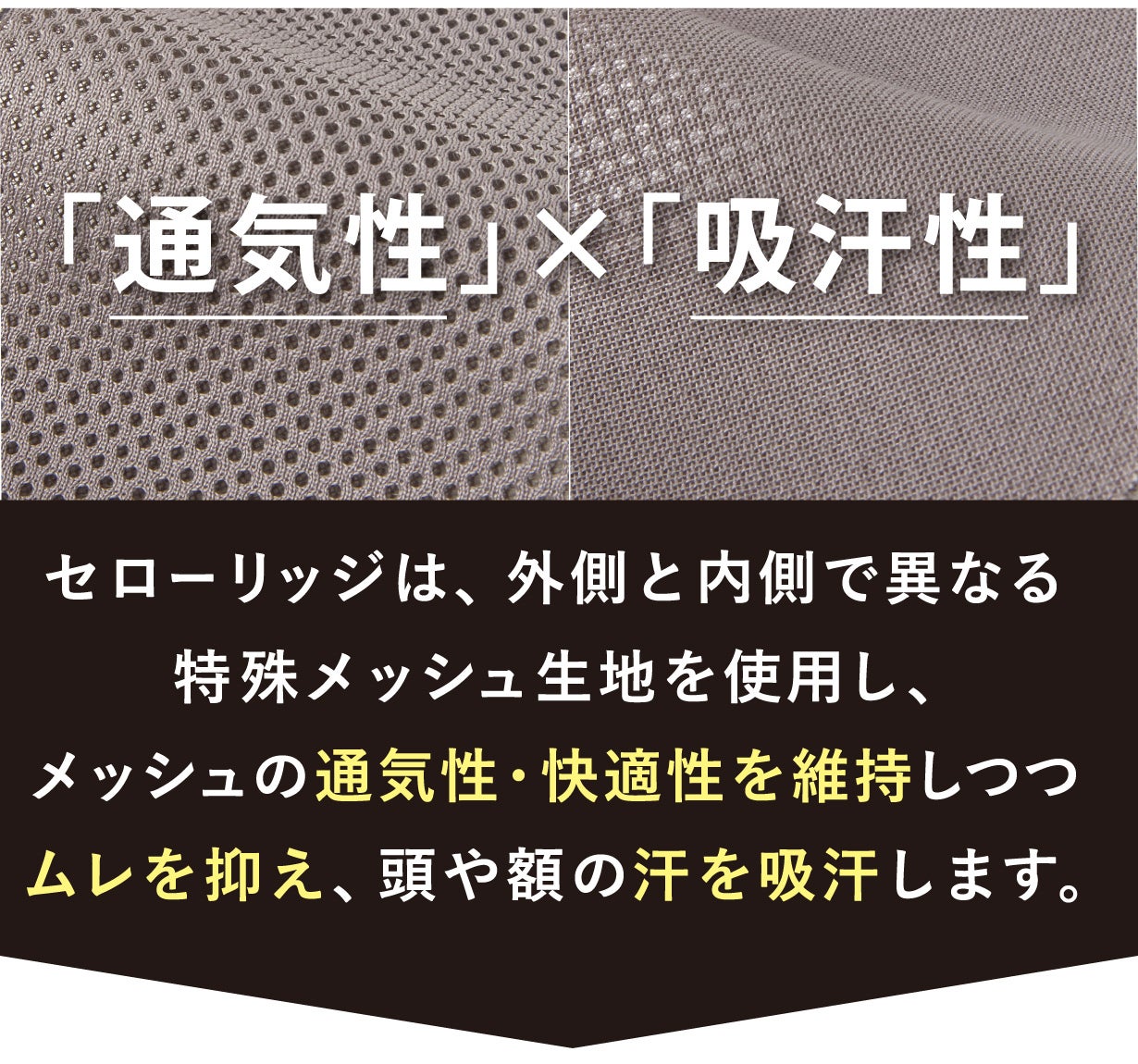 「高吸水帽子 セローリッジ」なら、従来のメッシュ(自社サンプル)と比べて約1.54倍の吸収力を誇る特殊メッシュが、スポンジのように汗をぐんぐん吸収!わずらわしい汗拭きの回数を減らし、スポーツや作業に集中できます。メッシュの通気性の良さに加え、振って水分を飛ばせば吸水力が復活します。