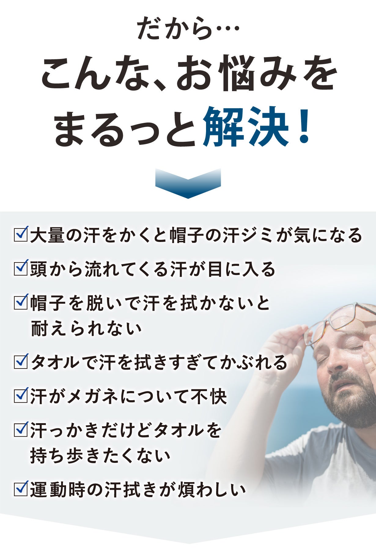 スポーツ中や炎天下での作業時、流れる汗が目に入ったり、こまめにタオルで拭いたりして煩わしく感じたことはありませんか?