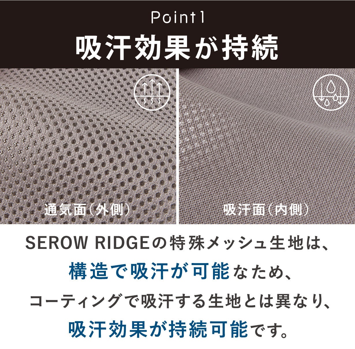 SEROW RIDGEの特殊メッシュ生地は表面と裏面が異なる縫製でつくられており、肌に当たる内側の面はきめ細かい生地になっており、汗を吸いやすく、外側の面は大きめメッシュで通気性の高いつくりになっています。