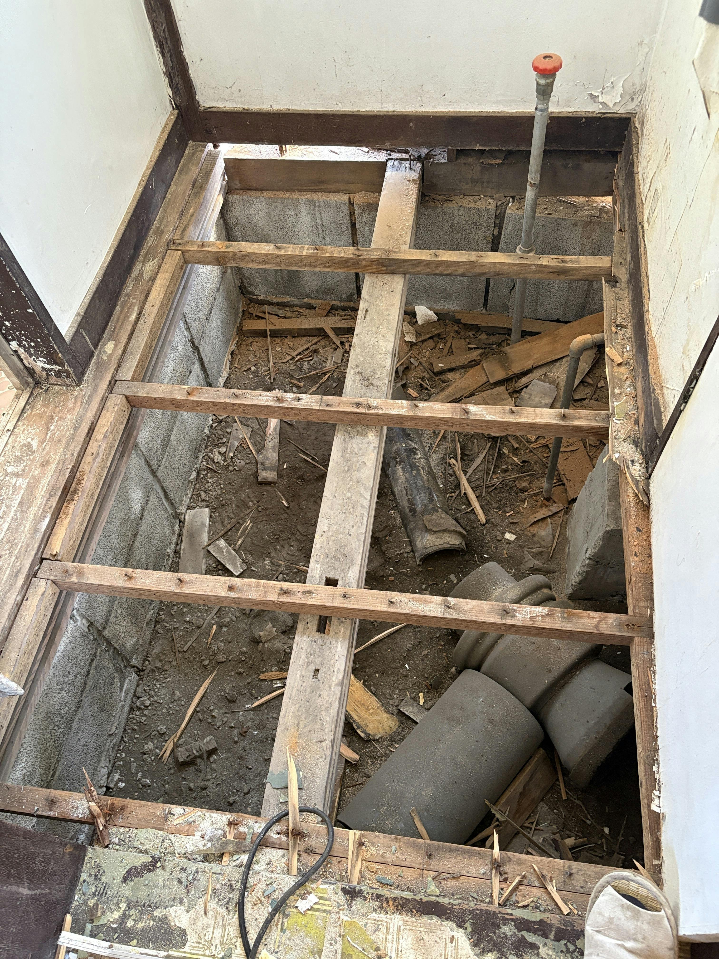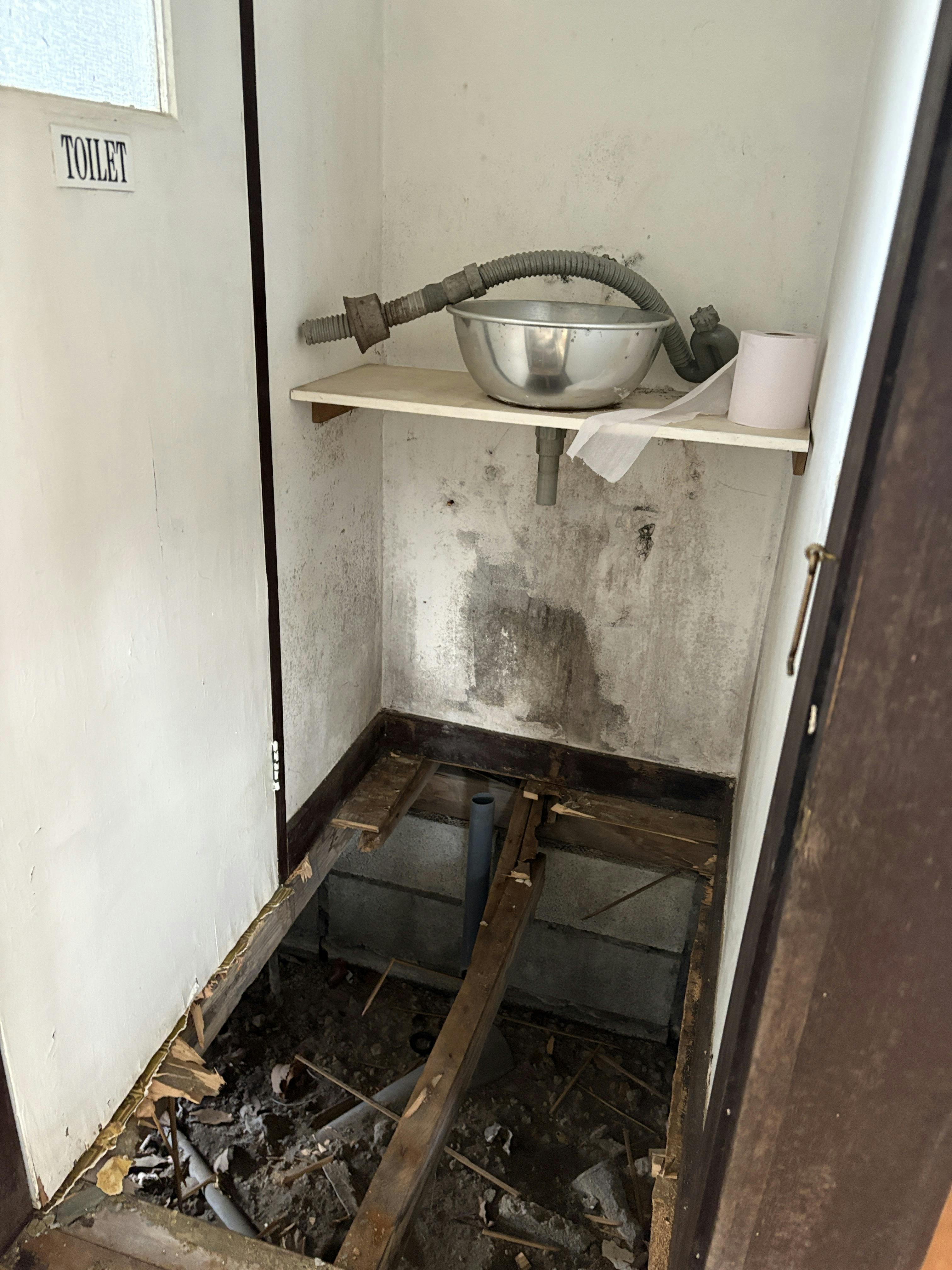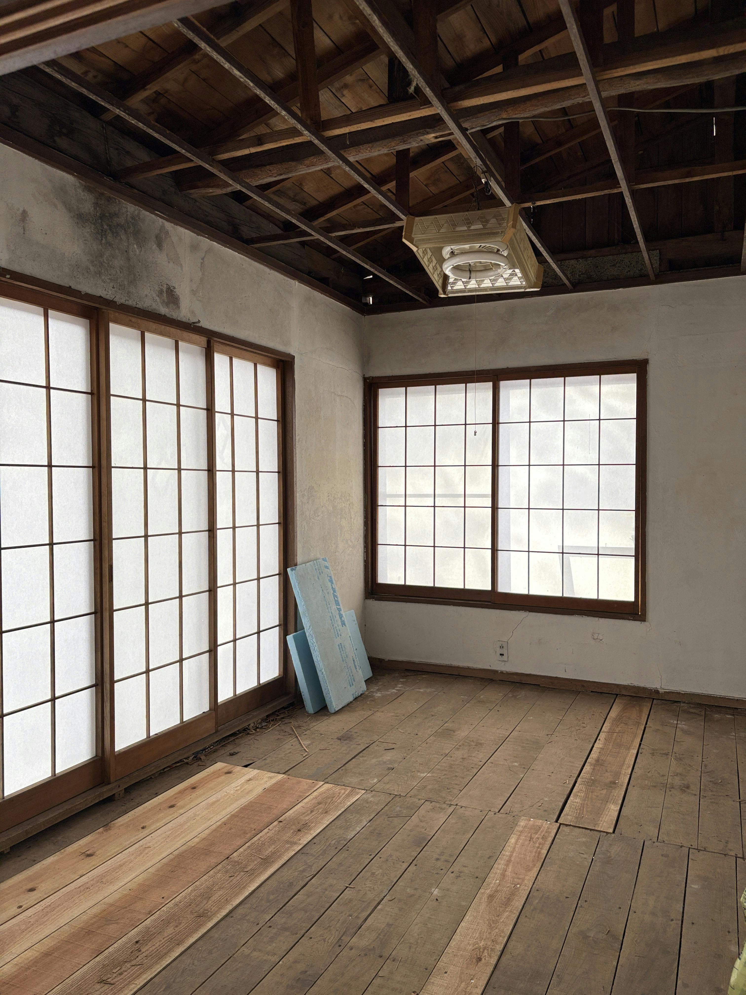 昨年秋ごろから私の想いに共感してくれた外国人の仲間達とともに少しずつ修繕を進めています。まずは雨漏り箇所を塞ぎ、屋内の傷んだ床や天井の木材を撤去するところまで作業が完了しました。現在、さらに快適な空間へと整えていくための準備を進めています。