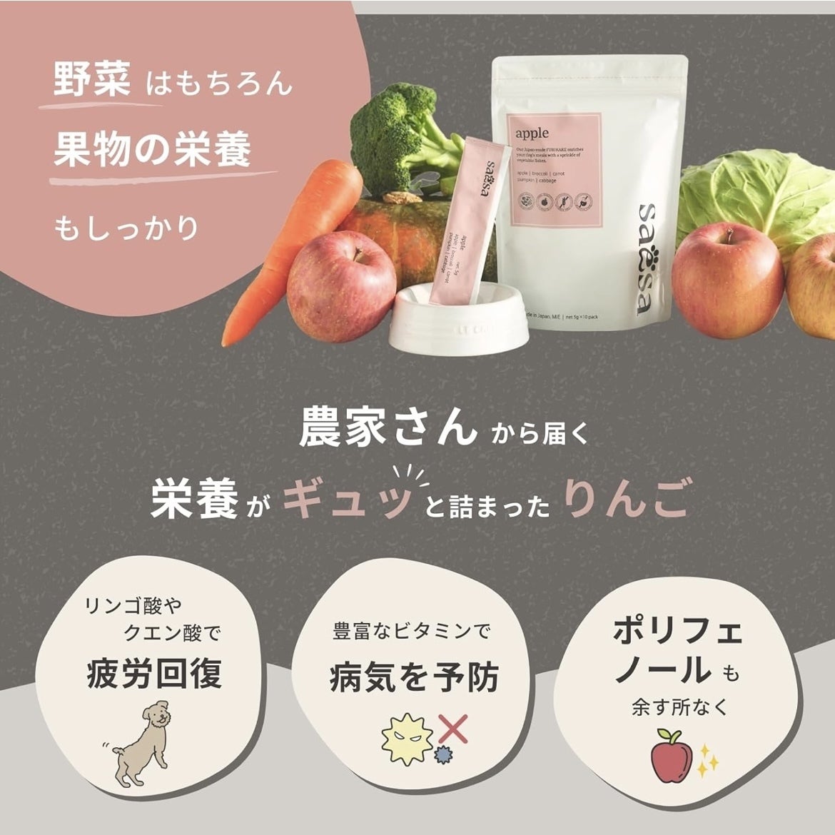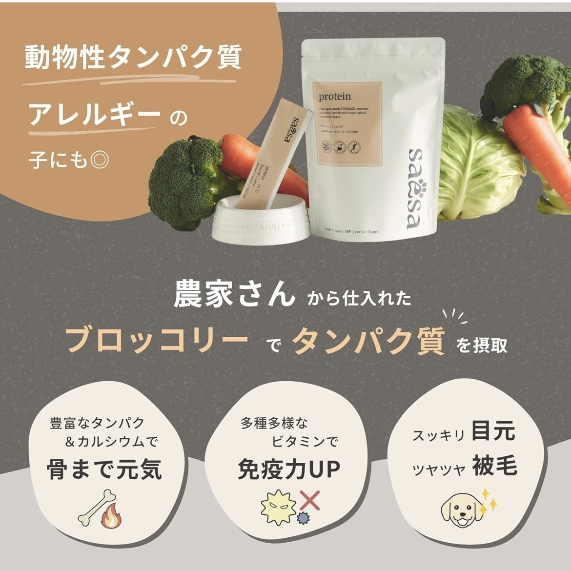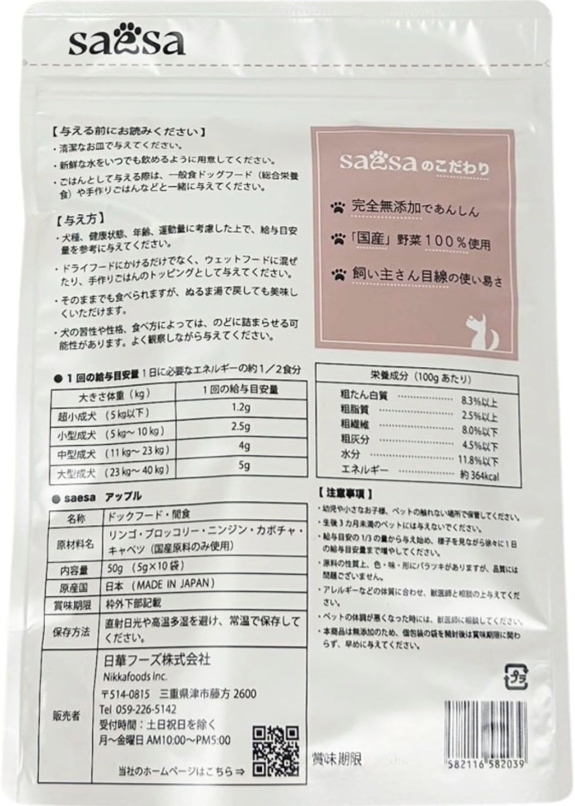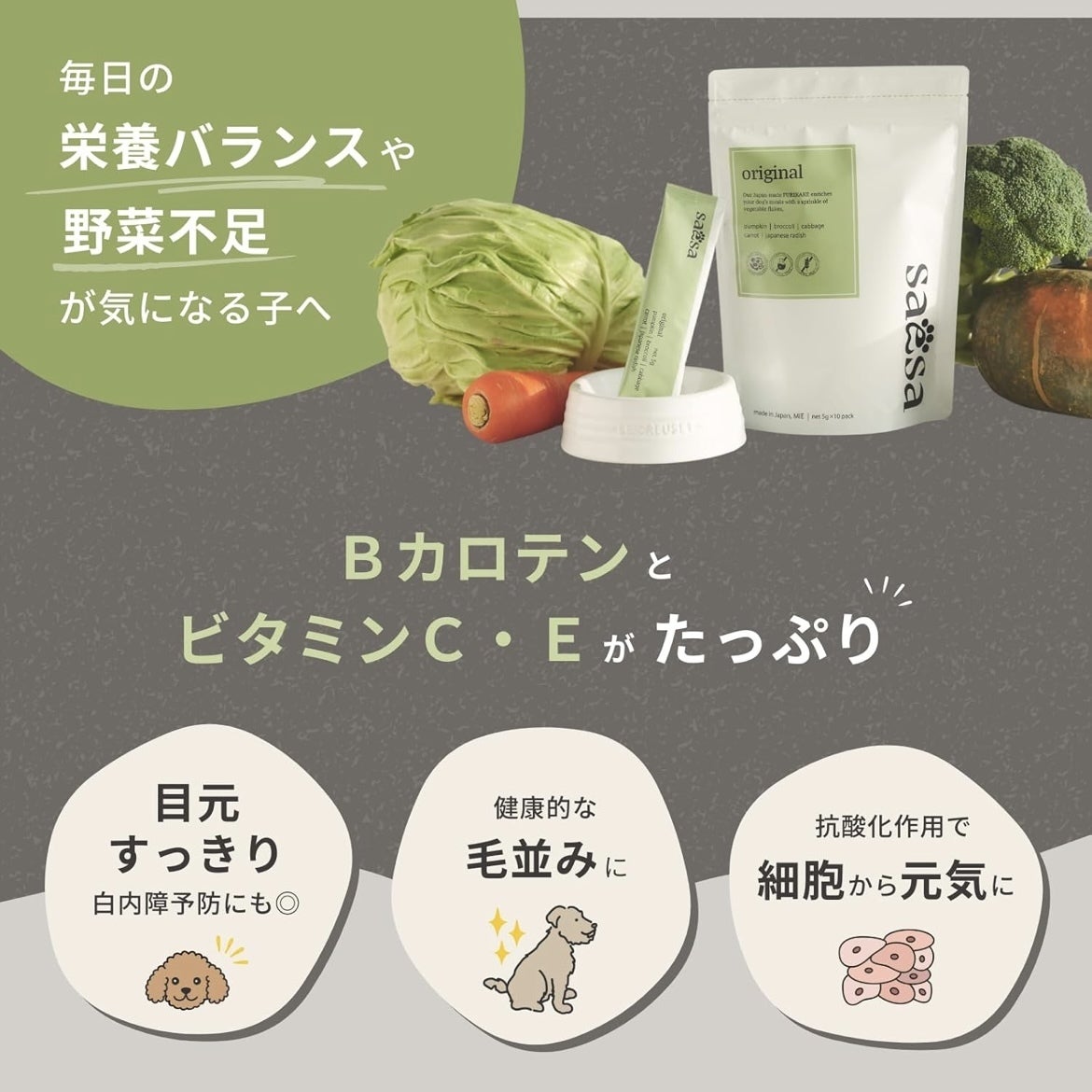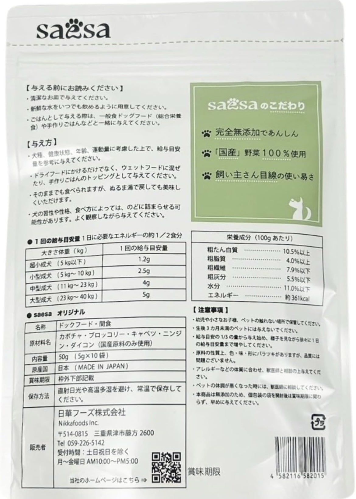 A.「高栄養価」独自の加工技術で野菜の栄養価をほとんど逃しません。「保存料・着色料不使用」かさ増しや食いつきのために使われがちなブドウ糖も一切使用しておりません。saesaは野菜本来の甘み・旨みがしっかり残るため使用しません。